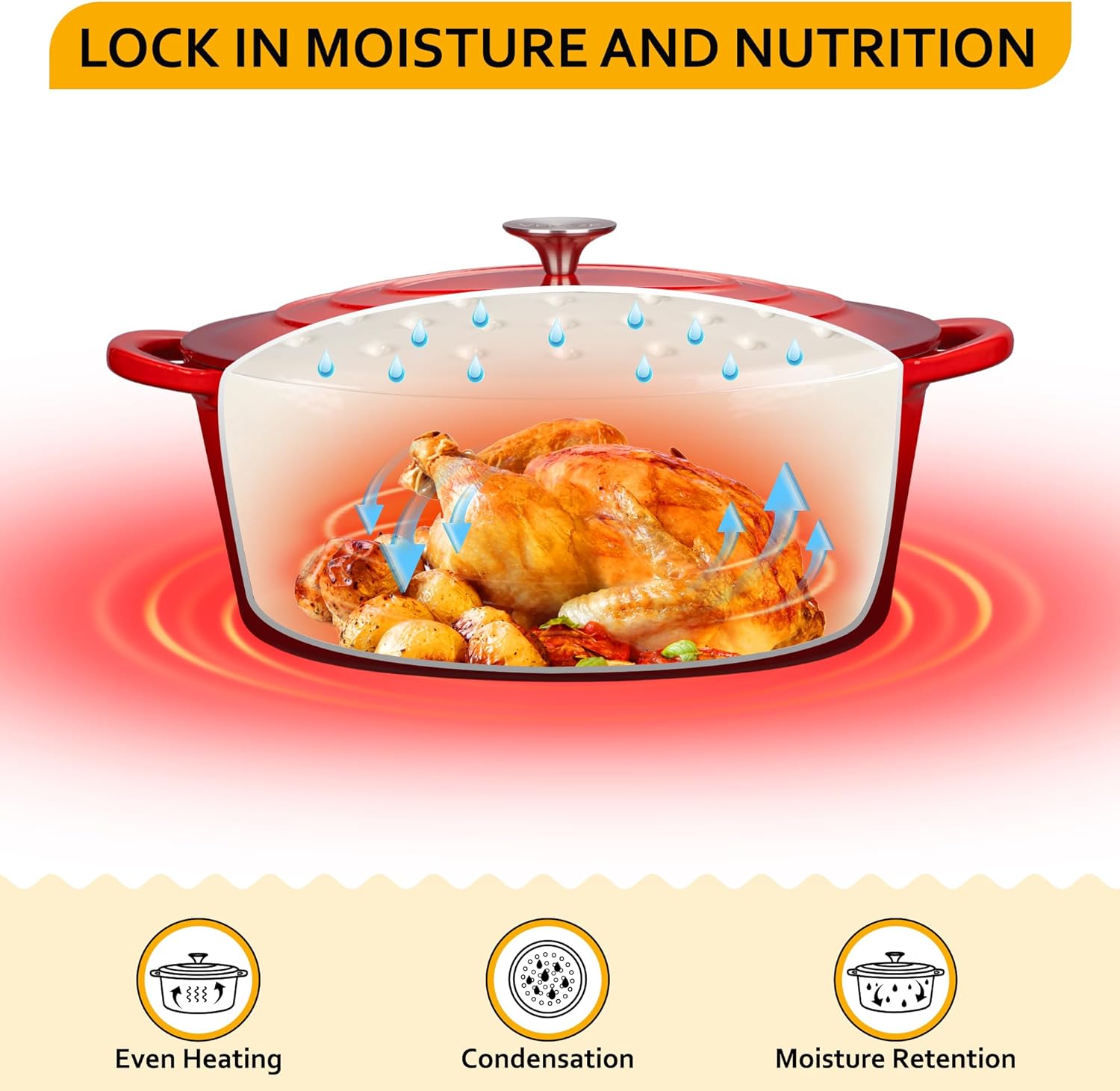 Velaze 7.5 QT Enameled Oval Dutch Oven Pot with Lid, Cast Iron Dutch Oven with Dual Handles for Bread Baking, Cooking, Frying, Non-stick Enamel Coated Cookware (RED)