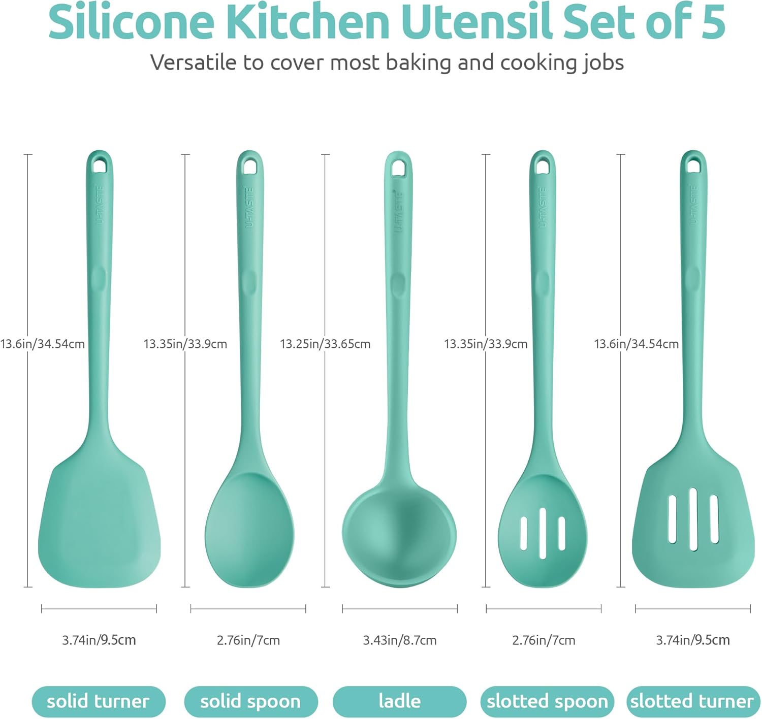 600ºF Heat Resistant Kitchen Utensil: U-Taste 13.6" Extra Long Silicone Cooking Tools Set, Food-Grade Non-Stick Solid and Slotted Turner Spatula, Mixing Spoon, and Soup Ladle (5 Pieces, Aqua Sky)