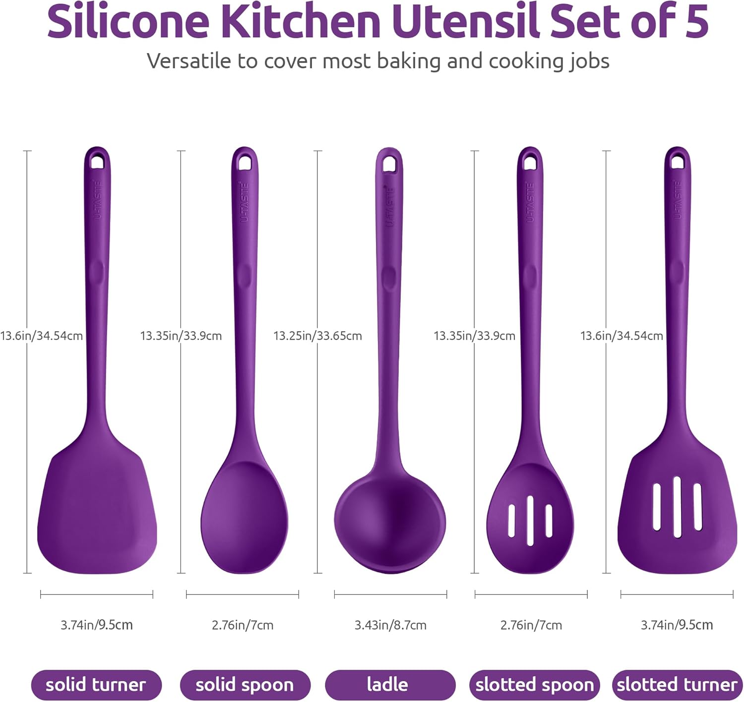 Silicone Kitchen Cooking Utensil Set: U-Taste 600ºF Heat Resistant 13.6in Extra Long Kitchen Tools, Food-Grade Non-Stick Spatula Turner Spoon Ladle for Stir Frying, Serving, Mixing (5 Pieces, Purple)