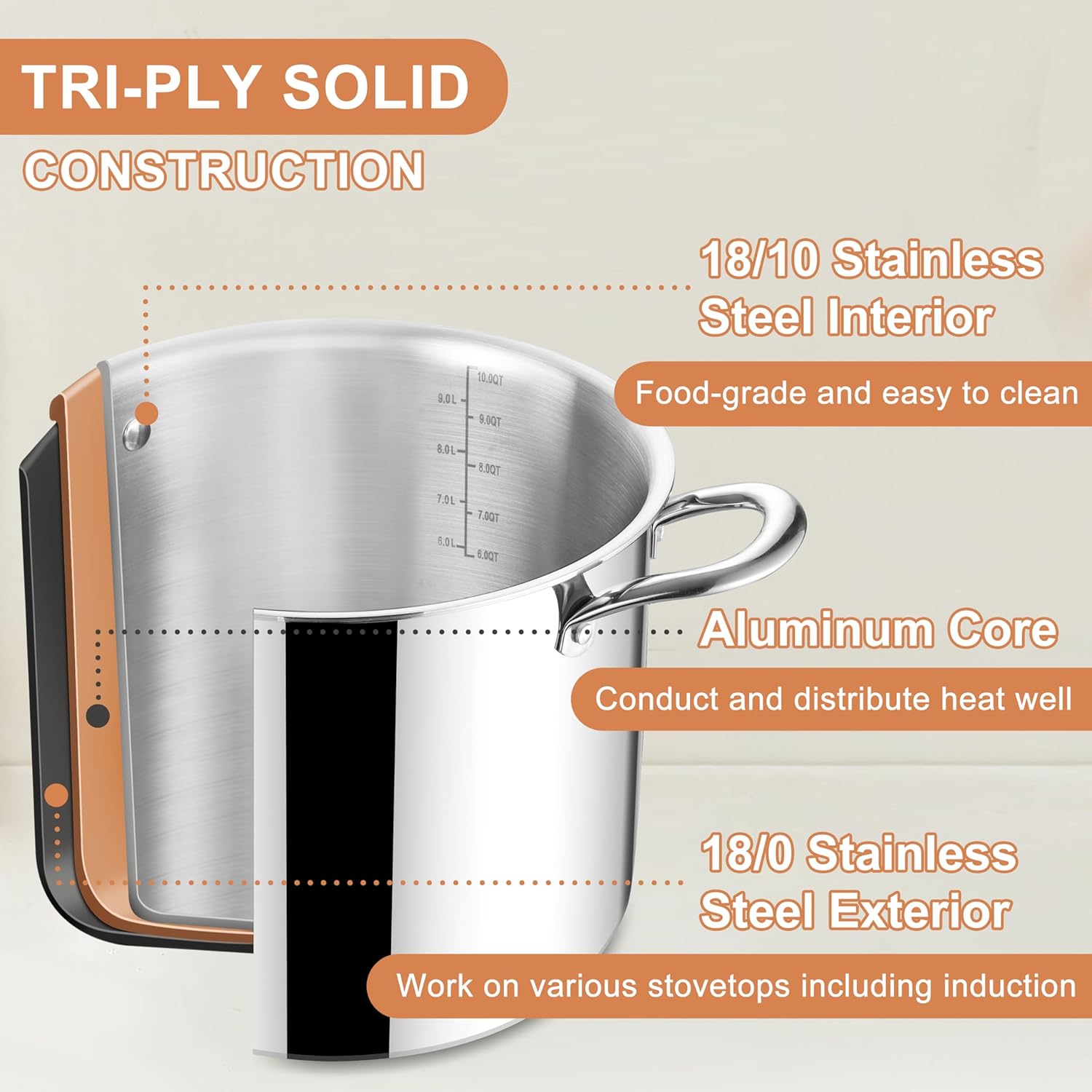 Herogo 10 Quart Stock Pot, 18/10 Stainless Steel Large Cooking Pot with Lid, 10 QT Metal Pasta Stockpot for Chicken Soup, Tri-ply Big Stockpot for Induction Gas Electric Stove, Dishwasher Safe