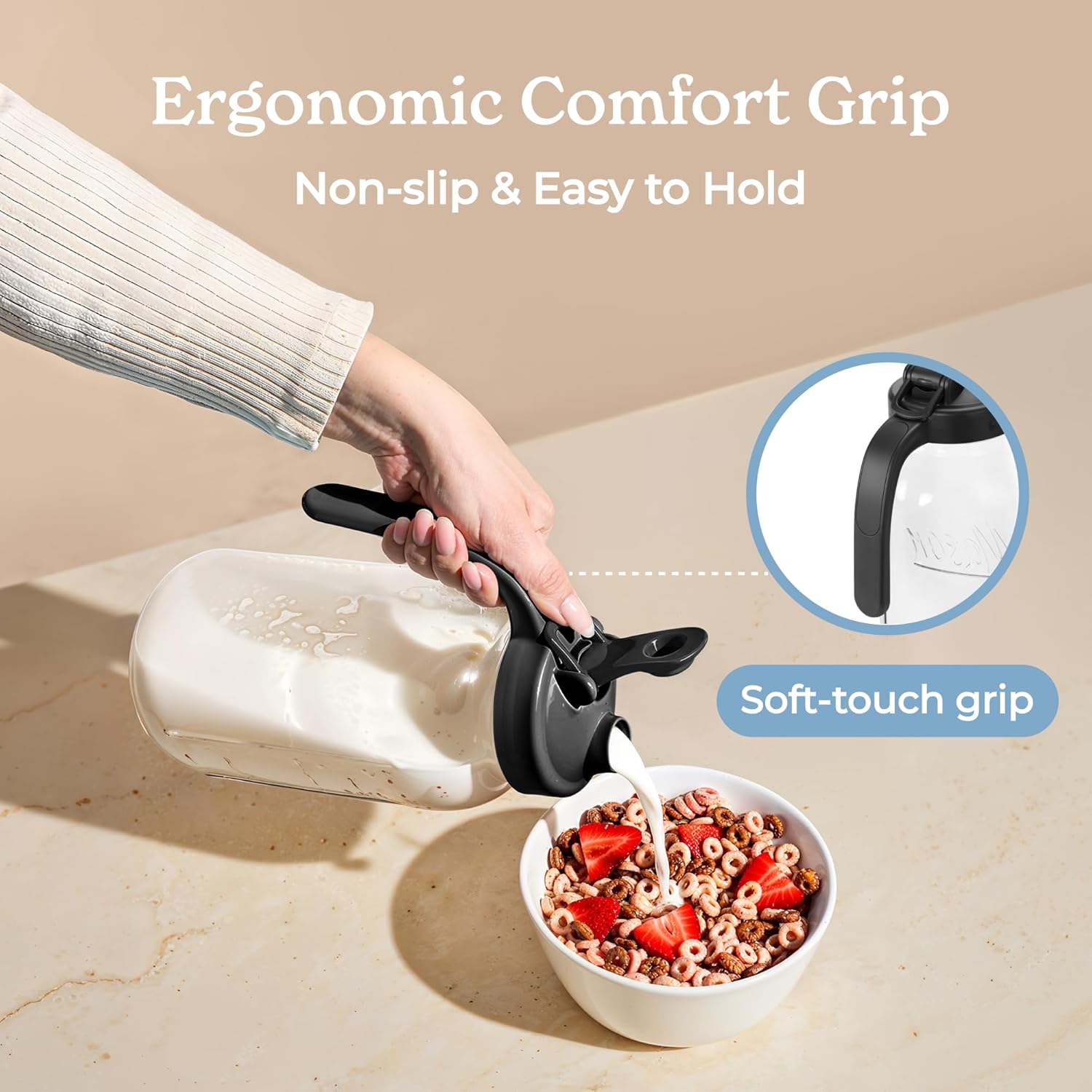 - Functional design: The non-slip handle on this 2 quart pitcher with lid ensures steady pouring.Hanging ring on this large mason jars adds convenience for easy carrying and storage