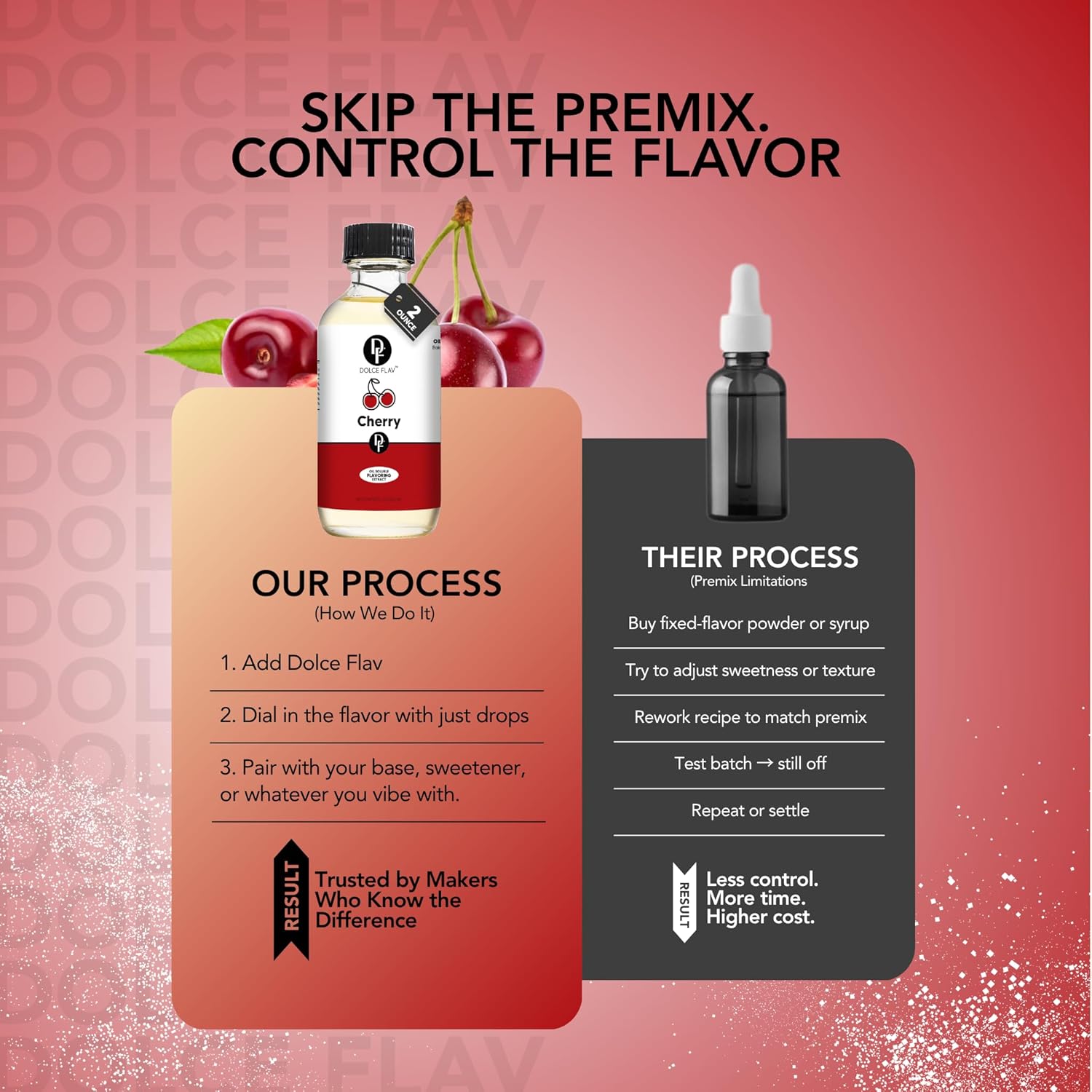 - Cherry Flavoring for Oil-Based Recipes: Our cherry concentrate excels in oil-based applications. It's the ideal choice for enriching your culinary creations with a bold cherry flavor, suitable for dishes where traditional extracts fall short.