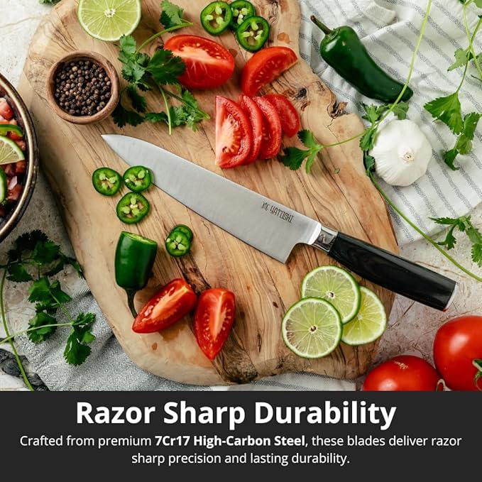 - High Carbon Blades: Made with premium 7Cr17 High Carbon Steel that provides a razor-sharp professional quality blade. The steel contains 0.6-0.75 carbon, making it two times tougher than other knives in its class with a Rockwell Hardness of 57-58.