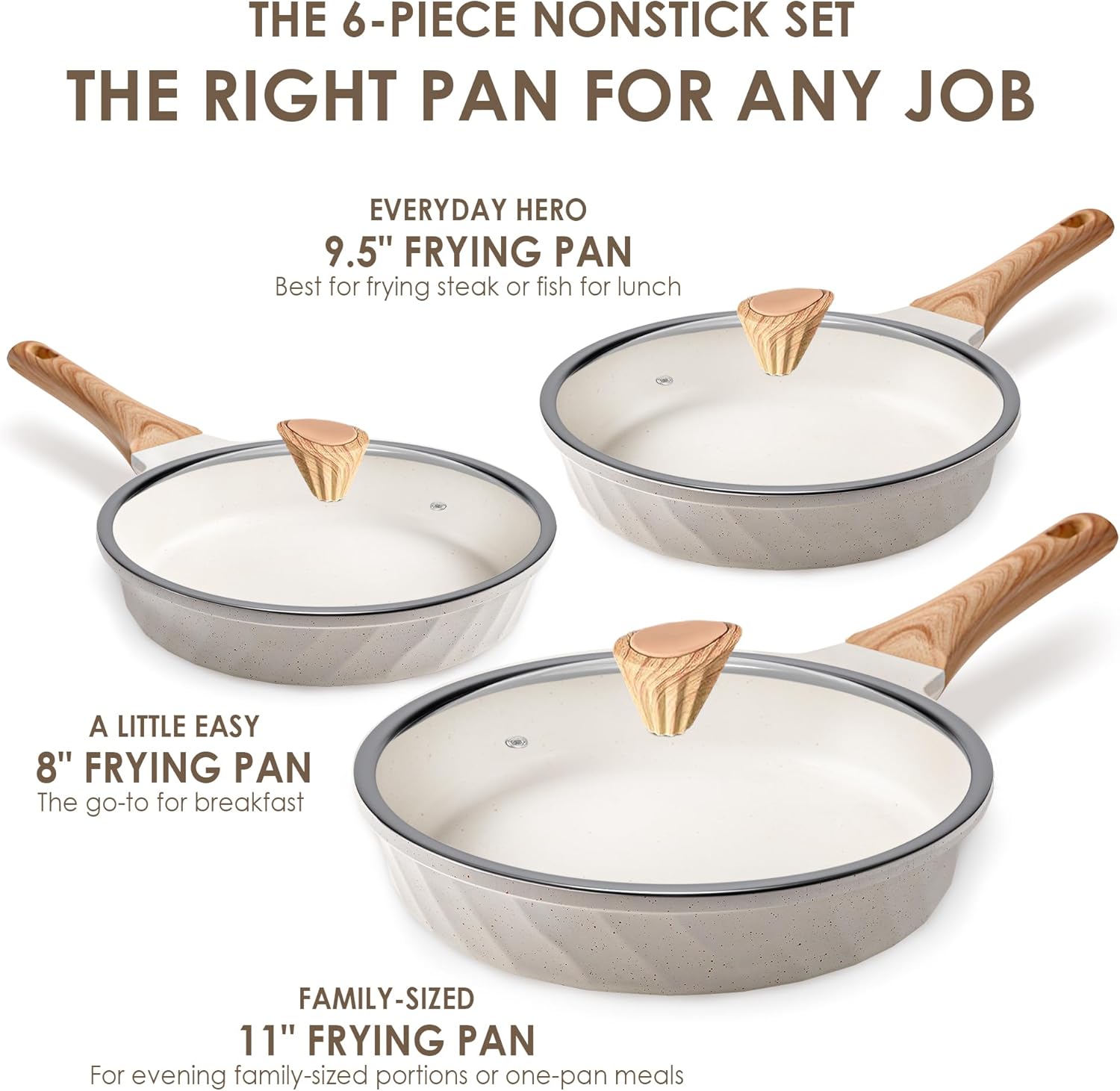 - 【3-Piece Nonstick Frying Pan with Lid】- 8 inch Frying Pan with lid - The go-to for breakfast and easy dish / 9.5 inch skillet with lid - Perfect for frying steak, or fish for lunch / 11 inch omelette pan with lid - For evening family-sized portions or one-pan meals. Great frying pans nonstick with lid for day-to-day cooking.