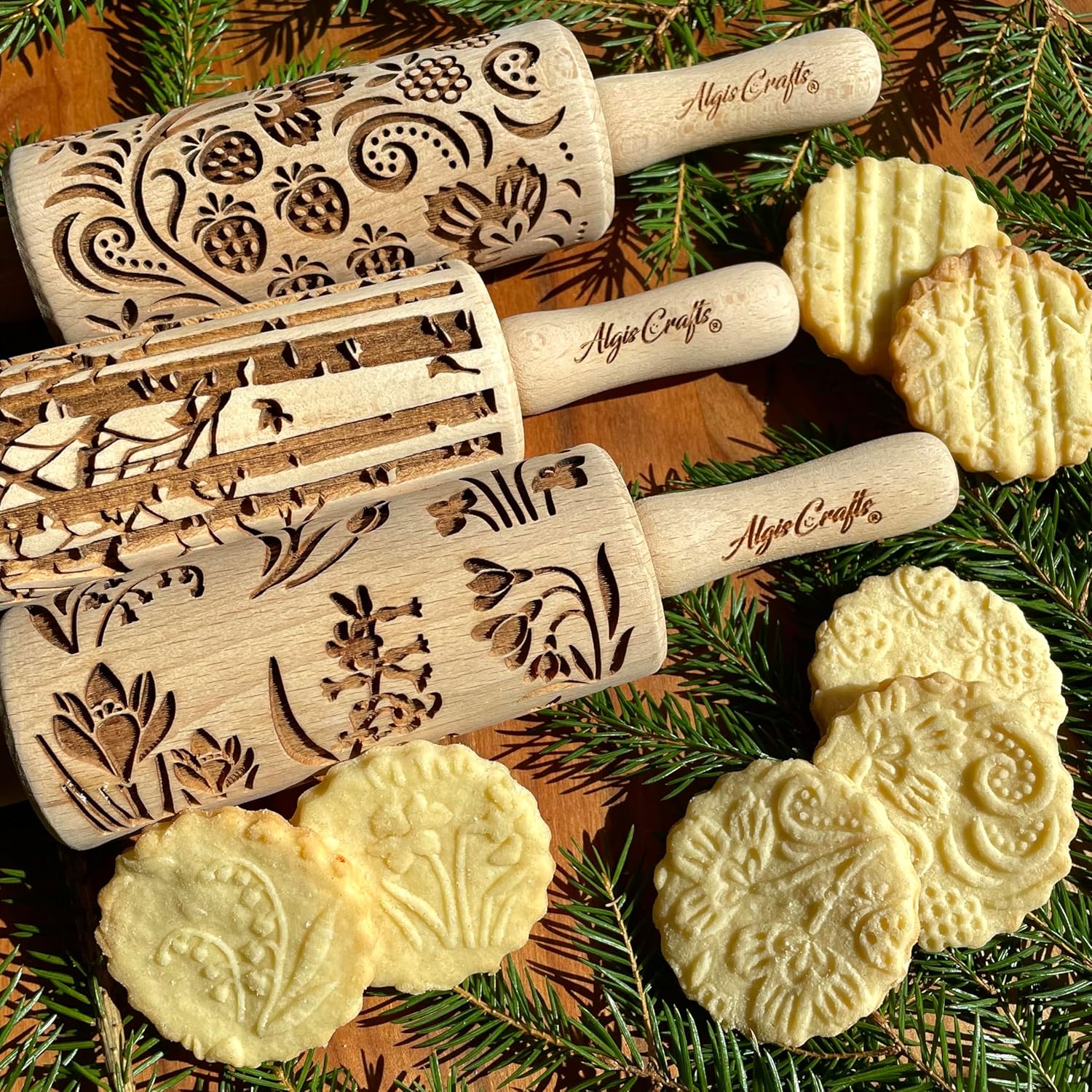 SEASONS 3 Mini Embossed Rolling Pin Set. Wooden Laser Cut Mini Rolling Pins for cookies or clay with spring flowers, tulips, daffodils, strawberries, raspberries, birch, trees by Algis Crafts