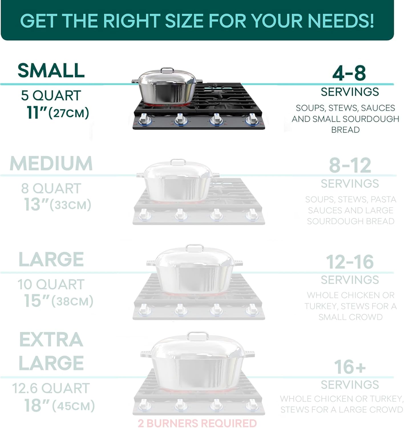 - DESIGNED FOR ALL CULINARY NEEDS: Available in four sizes — including 11" Small, 13" Medium, 15" Large, and 18" X-Large — this oval Dutch oven pot with lid caters to various family sizes and cooking preferences. Each set includes protective silicone handle covers and a stainless steel roasting rack for added convenience.