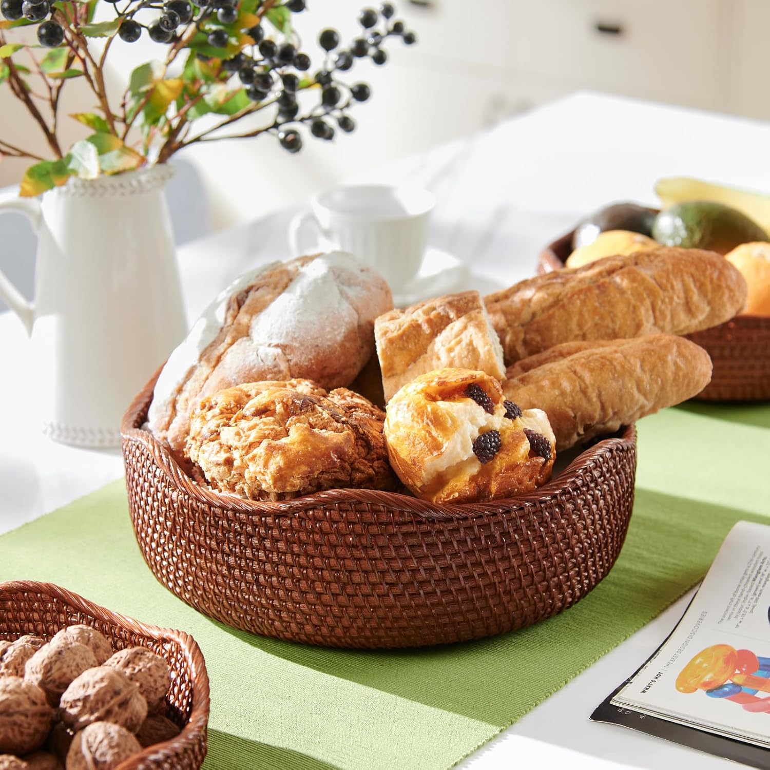 YANGQIHOME Rattan Round Fruit Baskets, Wicker Storage Bowls, Natural Woven Serving Basket Bowls, Decorative Baskets for Kitchen Counter Organizing, Brown, Set of 3