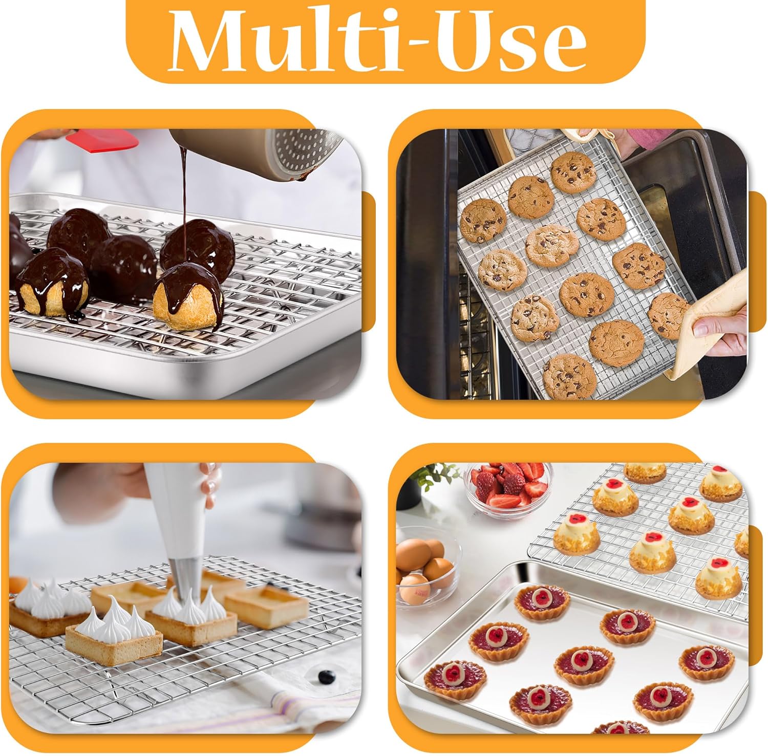 - Set of 4 & Multi-Use: Pack of 4, Included 2 baking tray sized 12.5 x 9.5 x 1 inch, 2 grid racks sized 11.75 x 9 x 0.75 inch, Enough for big meal or daily cooking needs, Ideal for baking crispy chicken / cookies, Roasting veggies / meat, Cooling cupcakes / bread, Draining grease / water, The baking rack not only be used with cookie pan, But also can hold and cool the food separately after baking