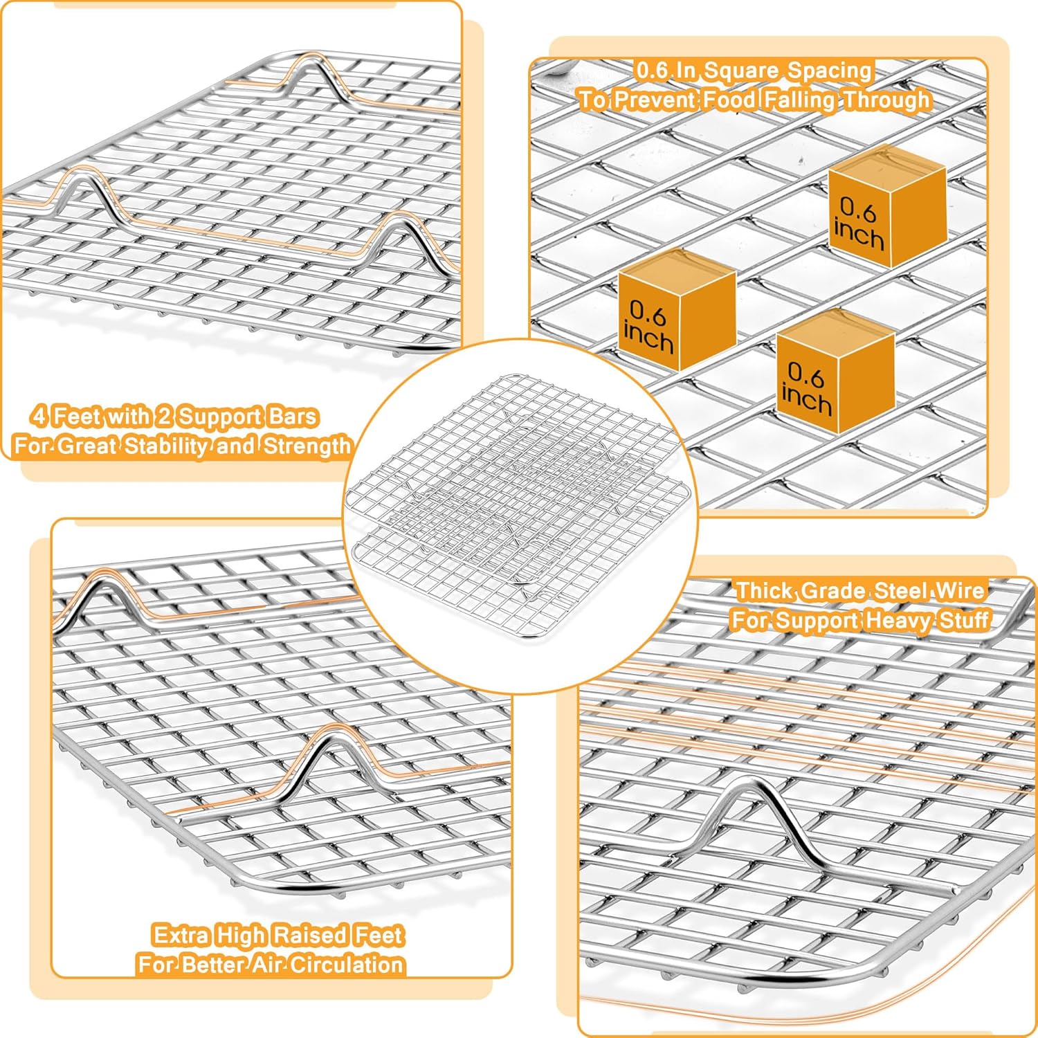- Solid Cooling Rack: The cooling rack with firmly welded dense lines, 0.6’’ small grid spacing let grease drip through while avoiding small stuff from falling through, Multiple welds with 2 thick cross bars strengthen the stability and loading structure, 4 thick elevated feet raised the entire rack up by 0.75 inch, Helps create proper air circulation for evenly baking and quickly cooling