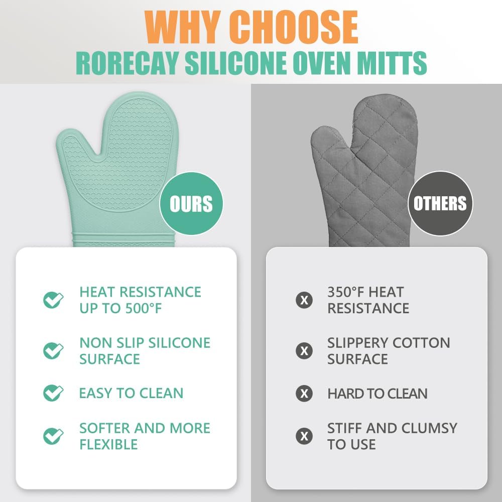 Rorecay 6pcs Oven Mitts and Pot Holders Sets Heat Resistant 500 Degrees, Extra Long Silicone Oven Gloves Non-Slip Potholders Hot Pads for Kitchen Baking Cooking, Quilted Liner, Bermuda Teal