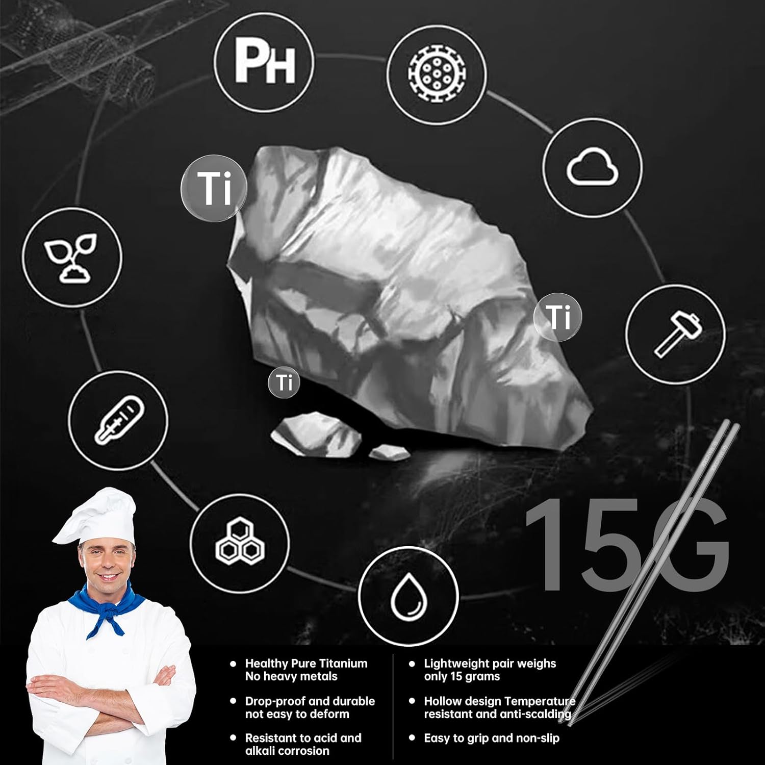 - 【Healthy Titanium Chopsticks】Titanium has no heavy metal precipitation, good compatibility with the human body, acid and alkali corrosion resistance, non-rusting, non-stringing properties, healthy titanium chopsticks are the ideal material for kitchen utensils