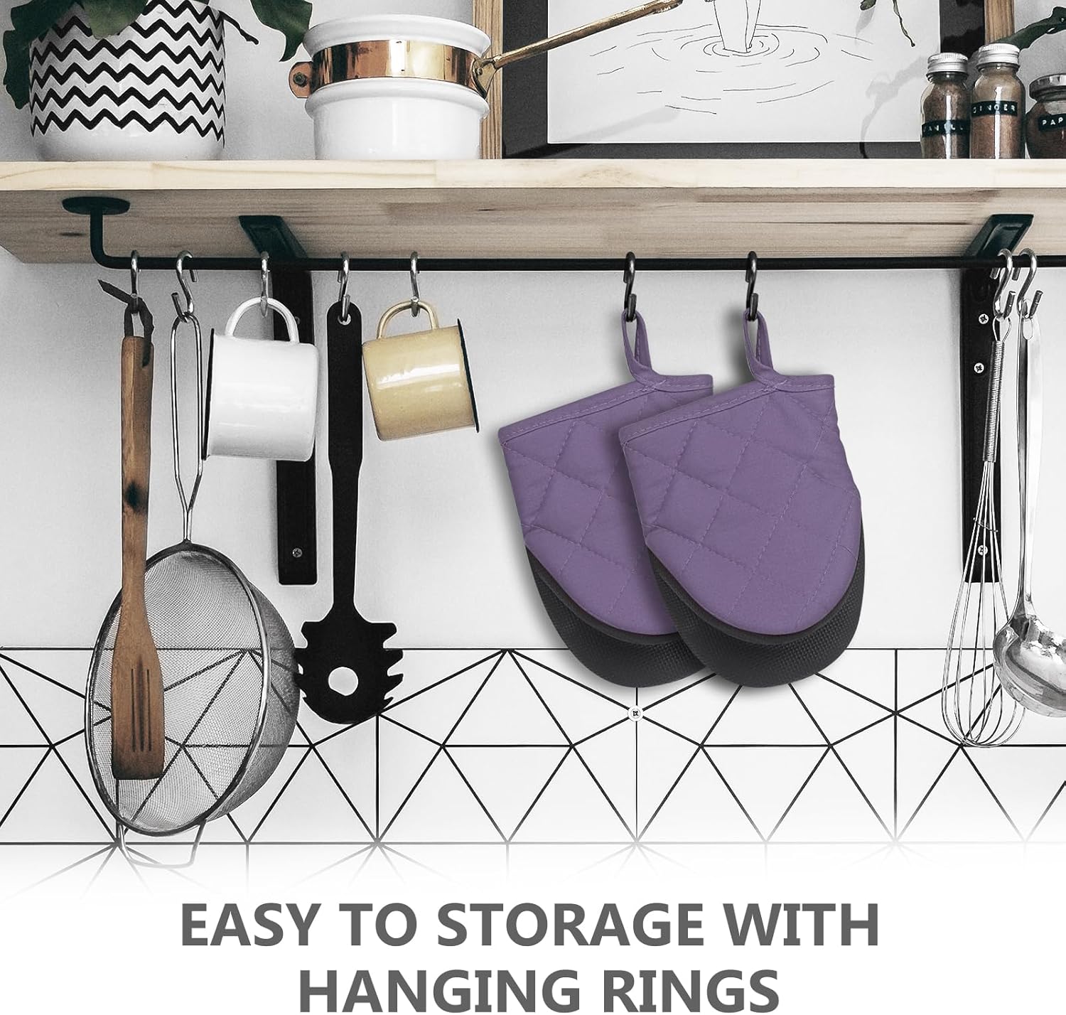 1 Pair Short Oven Mitts - Silicone Kitchen Oven Gloves High Heat Resistant 500℉, Mini Oven Mits with Non-Slip Grip Surfaces and Hanging Loop for BBQ, Baking, Cooking and Grilling (Purple)