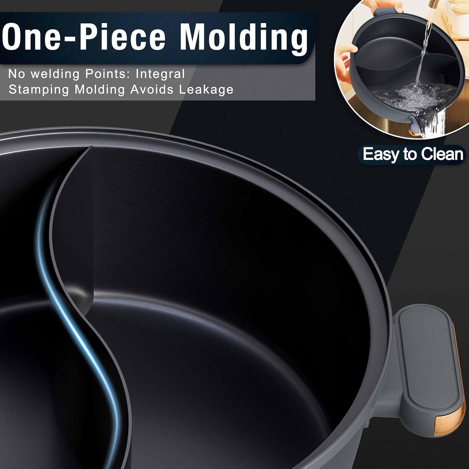 - Enjoy Two Flavors at Once - This electric hot pot is PFOA-free and features an integrated divider, allowing you to cook both spicy and mild broth at the same time. Its seamless compartments are designed in an S-shape to prevent overflow and leakage, providing a hassle-free cooking experience and satisfying different flavor preferences in a single pot.