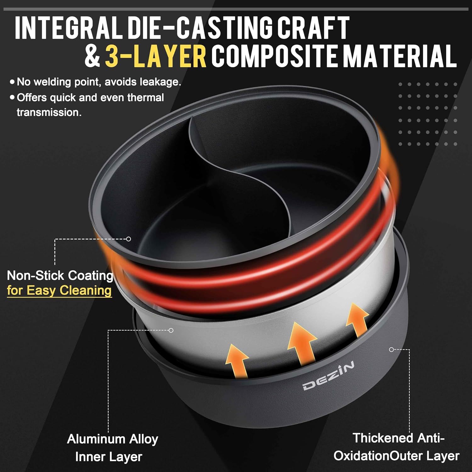 - Non-Stick Coating - The Dezin electric hotpot pot features a high-quality non-stick coating, providing excellent food release and easy cleaning. With this coating, you can enjoy cooking without worrying about food sticking to the pot. It also enhances stir-frying, making your cooking experience smooth and enjoyable.