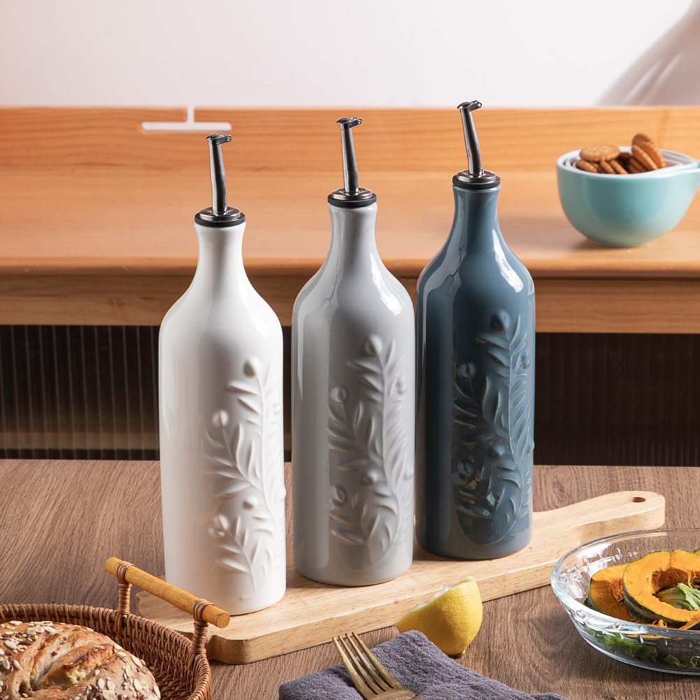 Sweejar Large Olive Oil Dispenser Bottle with Spout, 24 Oz Ceramic Oil Dispenser for Kitchen, Relief Opaque Oil Cruet, Oil Container for Cooking, EVOO, Avocado Oil, Vinegar, Pack of 1(Fog Blue)