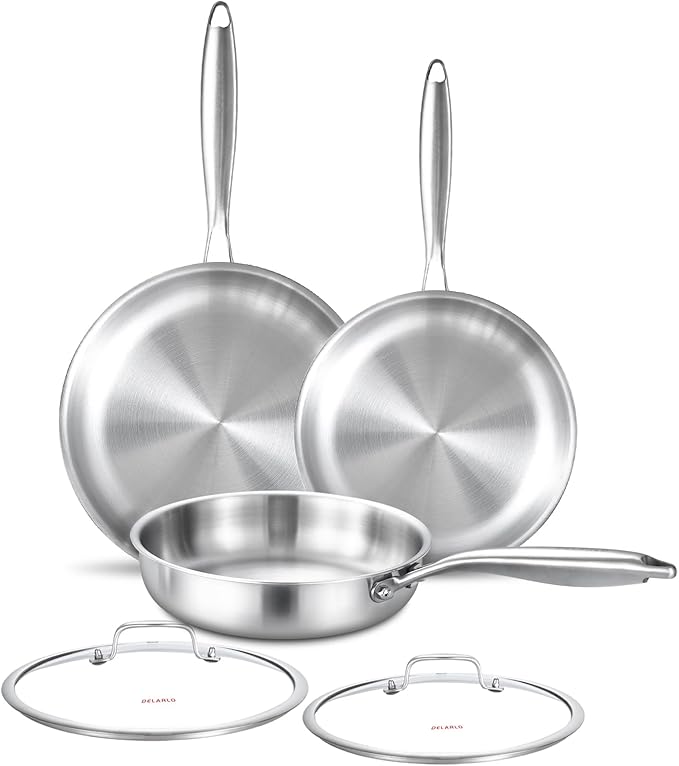 - 【Practical and Elegance】Delarlo Tri-Ply Stainless Steel Pan Combines Ergonomic cookware Design and superior features for optimal cooking performance. The rounded and encapsulated rim for drip free pouring and easy transfers,Rivet-free surface to eliminate food traps