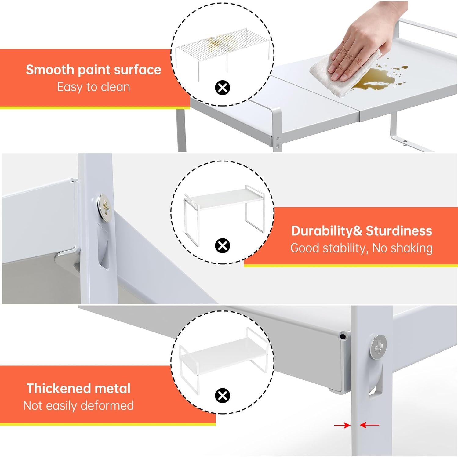 - Kitchen Counter and Cabinet Shelf is made from sturdy metal and capable of holding up to 30lbs, making it rugged and durable enough to store all your kitchen utensils and other items such as bottles, cans, bowls, plates, pans, soup pots, and more.