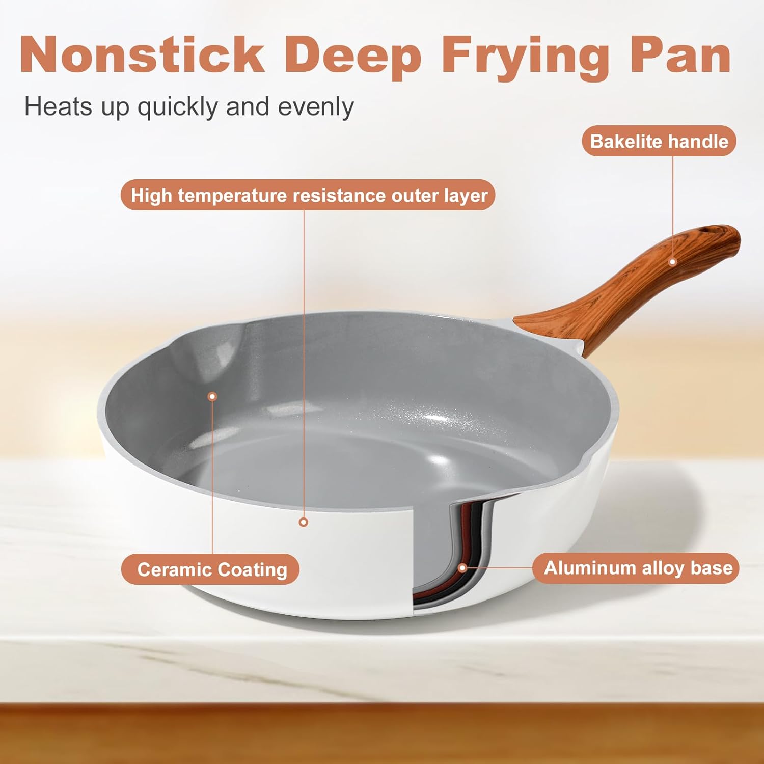 Nonstick Ceramic Frying Pan With Lid, 10 Inches Deep Frying Pan Non Stick Skillet With Pour Spout, Non Toxic Cookware for Stove, Induction, Gas, PB/CD/PFOA Free (White,10 Inches)