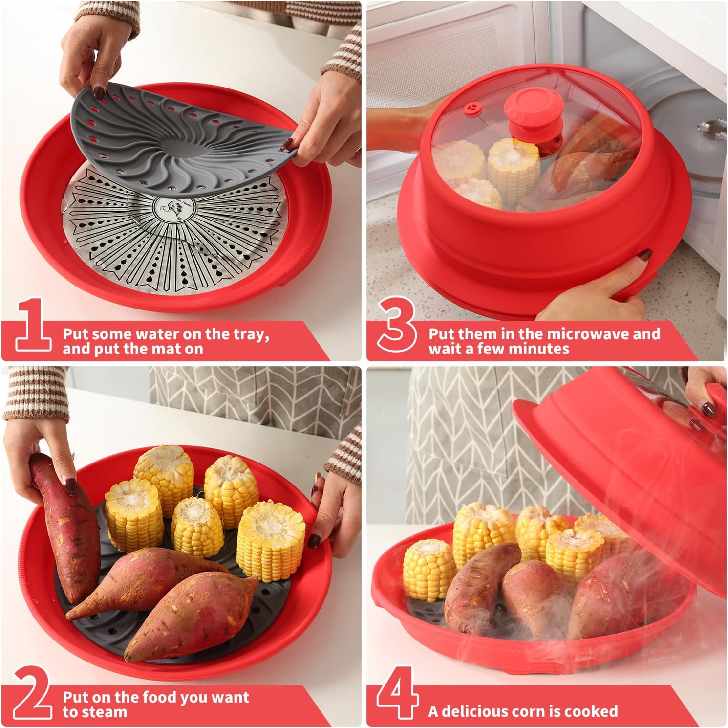 - 【Food Grade Material】: Food safe durable tempered glass and silicon, BPA and chemical free, High-temperature resistant glass, Foldable silicon microwave cover, Includes plate cover and tray to protect your microwave from splashes and spots. The tray has two handles to prevent burns and allow you to quickly remove heated food.