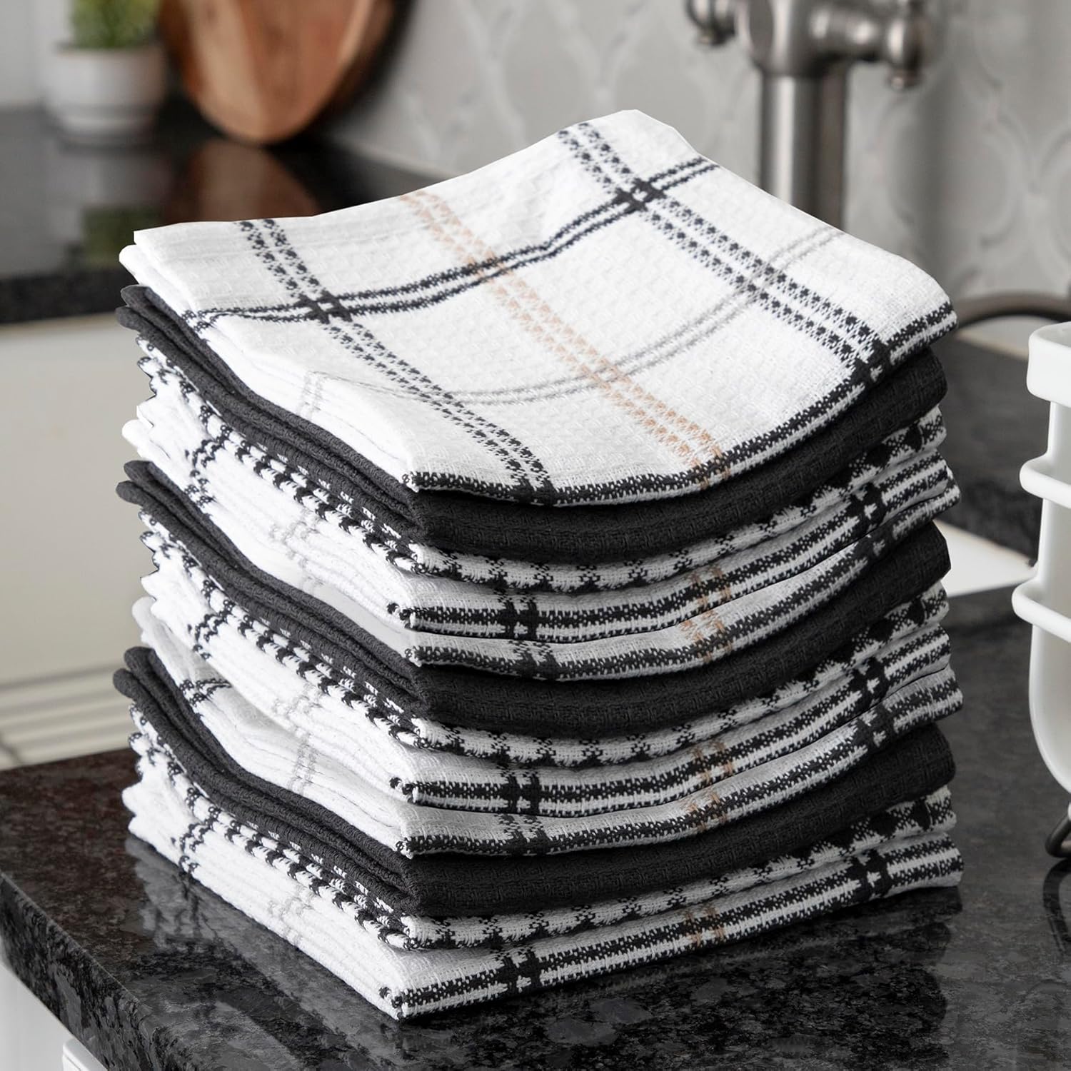 - ATTRACTIVE DESIGN. Set includes 12 kitchen dish cloths with vividly colored, coordinating weave design and includes 6 checked dish cloths, 3 striped kitchen dish cloth, and 3 solid dish cloths.