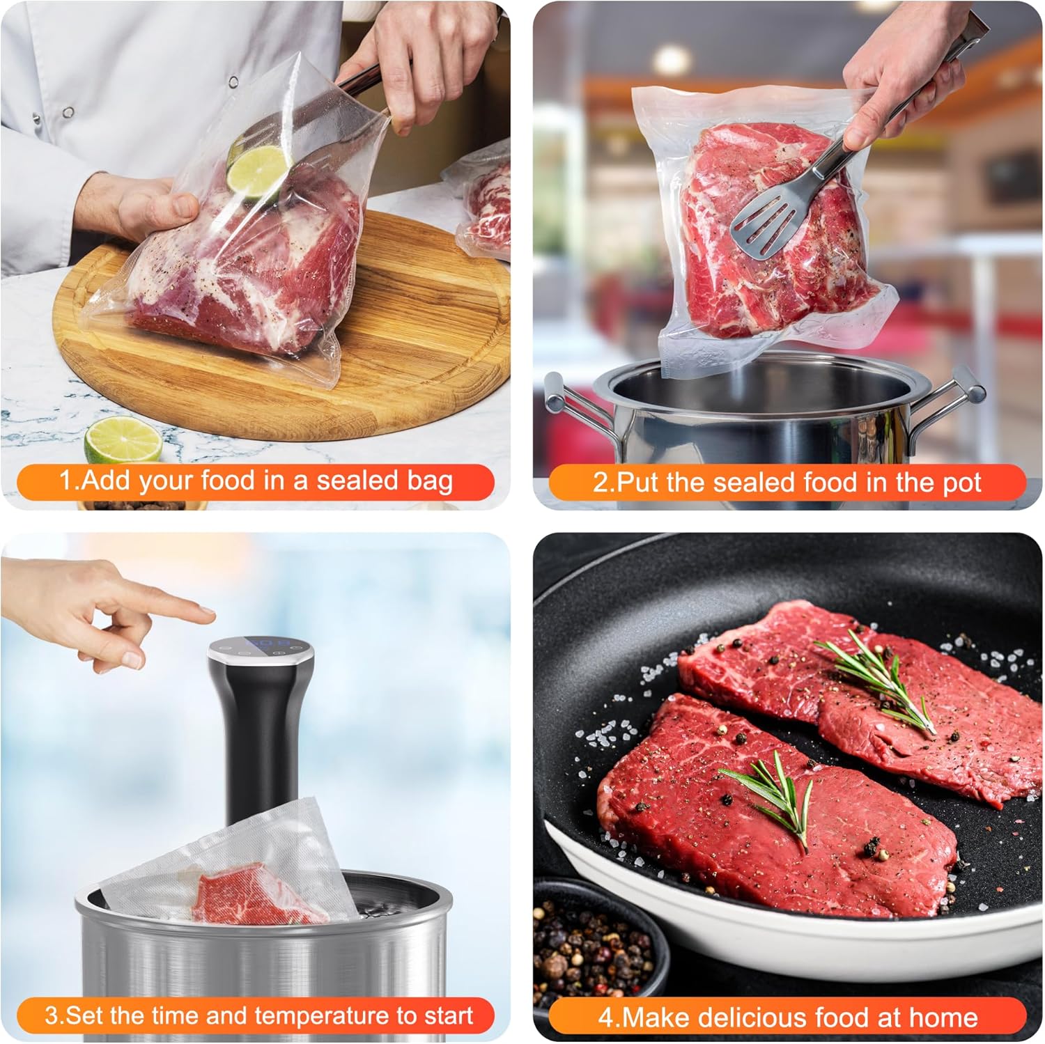 - 【1100W Ultra-Quiet Fast Heating】This sous vide cooker realizes 1100W ultra-fast water heating. It adopts an ultra-quiet design, below 20 dB within 1 meter, and efficiently transfers heat through a 360° water circulation system. The constant temperature prevents the fiber of the ingredients from being destroyed and easily achieves the high-quality cooking effect of the Michelin restaurant level. and you can cook various ingredients such as beef, chicken, pork, vegetables, fish and shellfish, eggs