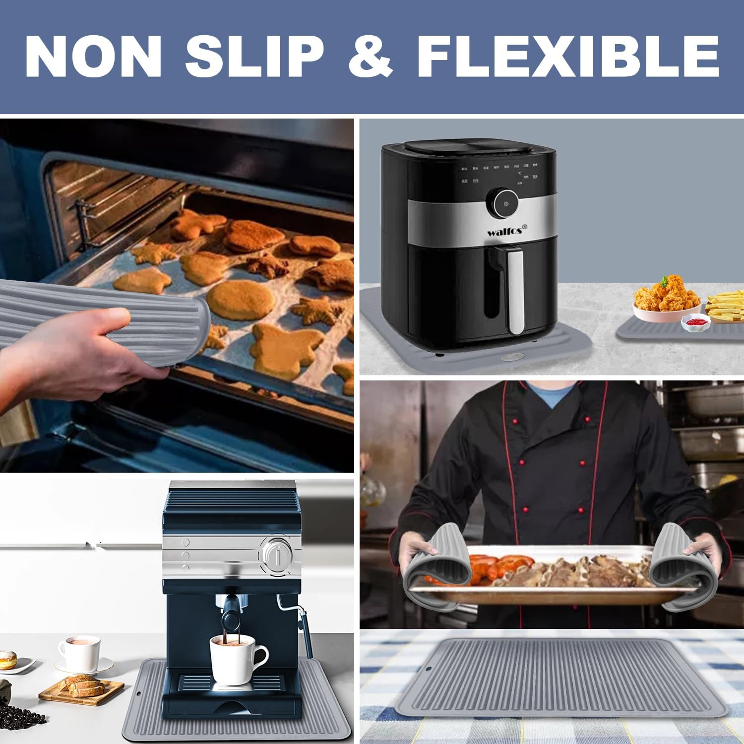 - MULTIFUNCTIONAL: As the large trivets for hot pots and pans are non-slip, flexible and soft, thick, not only suitable for large cookware such as air fryers, coffee makers, large hot dishes, but also can be used as pot holder, dish drying mats, spoon rest, pet bowl tray, pot mat and more. Folded up silicone pot holders are also perfect for use in the oven, microwave or refrigerator to protect your hands from hot and cold