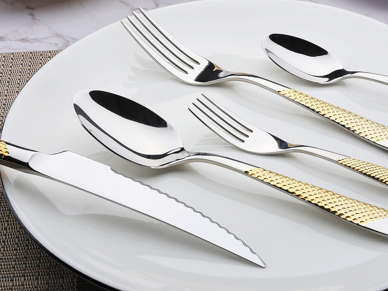 - 【Simple Desgin】The embossed pattern on the handle is a major feature of this cutlery set.The gold-plated process is adopted. The concave-convex pattern makes you not slippery in use. The design of the whole set of flatware looks simple and fashionable.