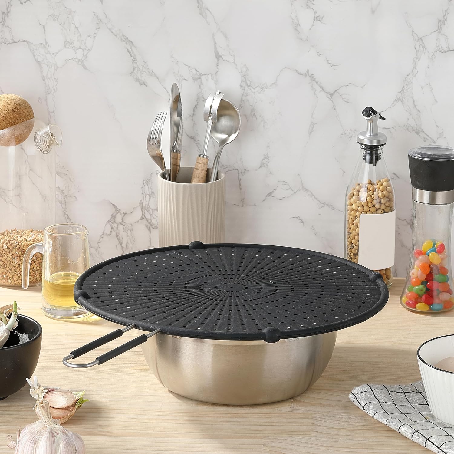 - 1. Mess-Free Cooking: Say goodbye to messy stovetops and splattered countertops.Our silicone splatter screen for frying pan is your kitchen's shield against oil and food splatters,ensuring a clean cooking experience every time.Having this grease splatter guard, enjoy stress-free cooking without the hassle of cleaning up stubborn grease stains. Keep your kitchen spotless and focus on perfecting your favorite recipes.