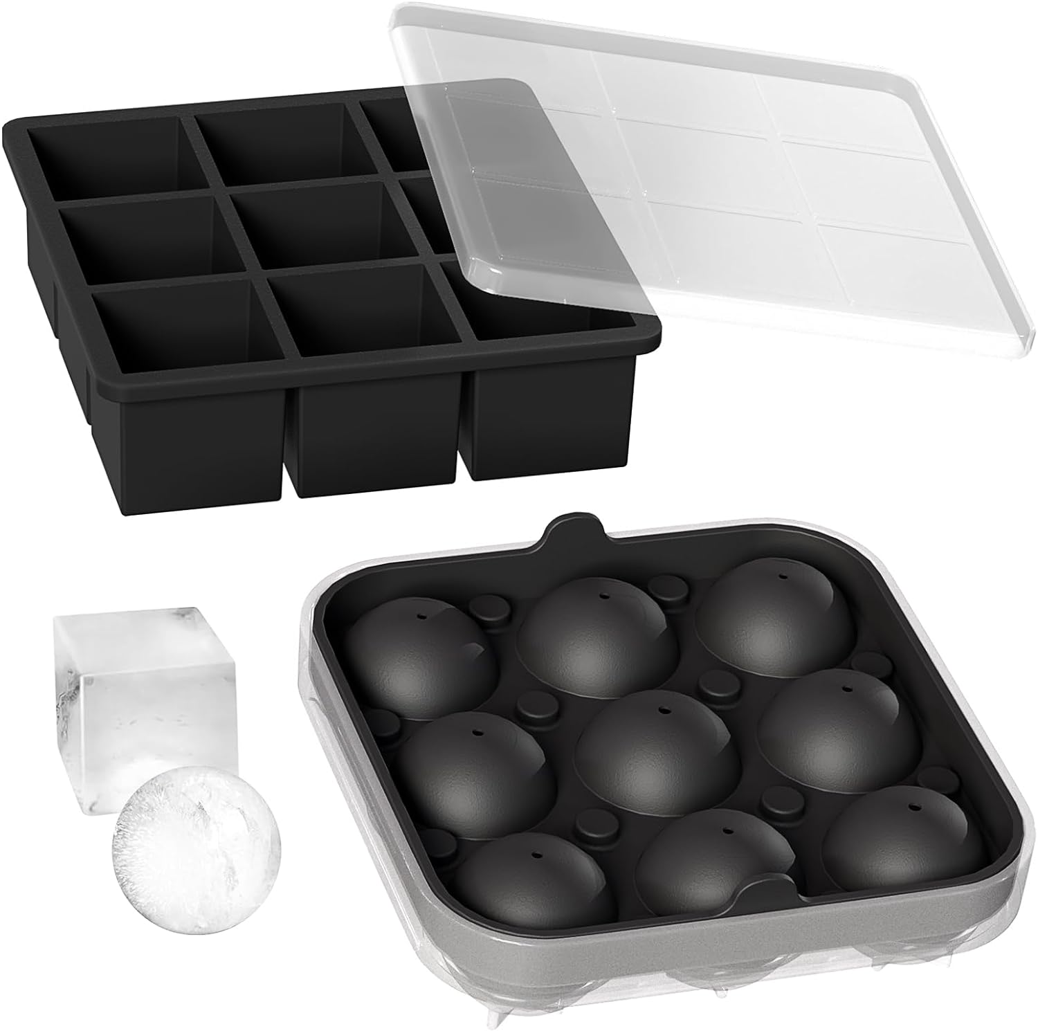 Wanderworld Ice Tray Combo, Silicone Reusable 2 inch Big Ice Freezer Mold, 9 Cubes& 9 Sphere Ice Maker tray with lid for Whiskey, 2 pack.