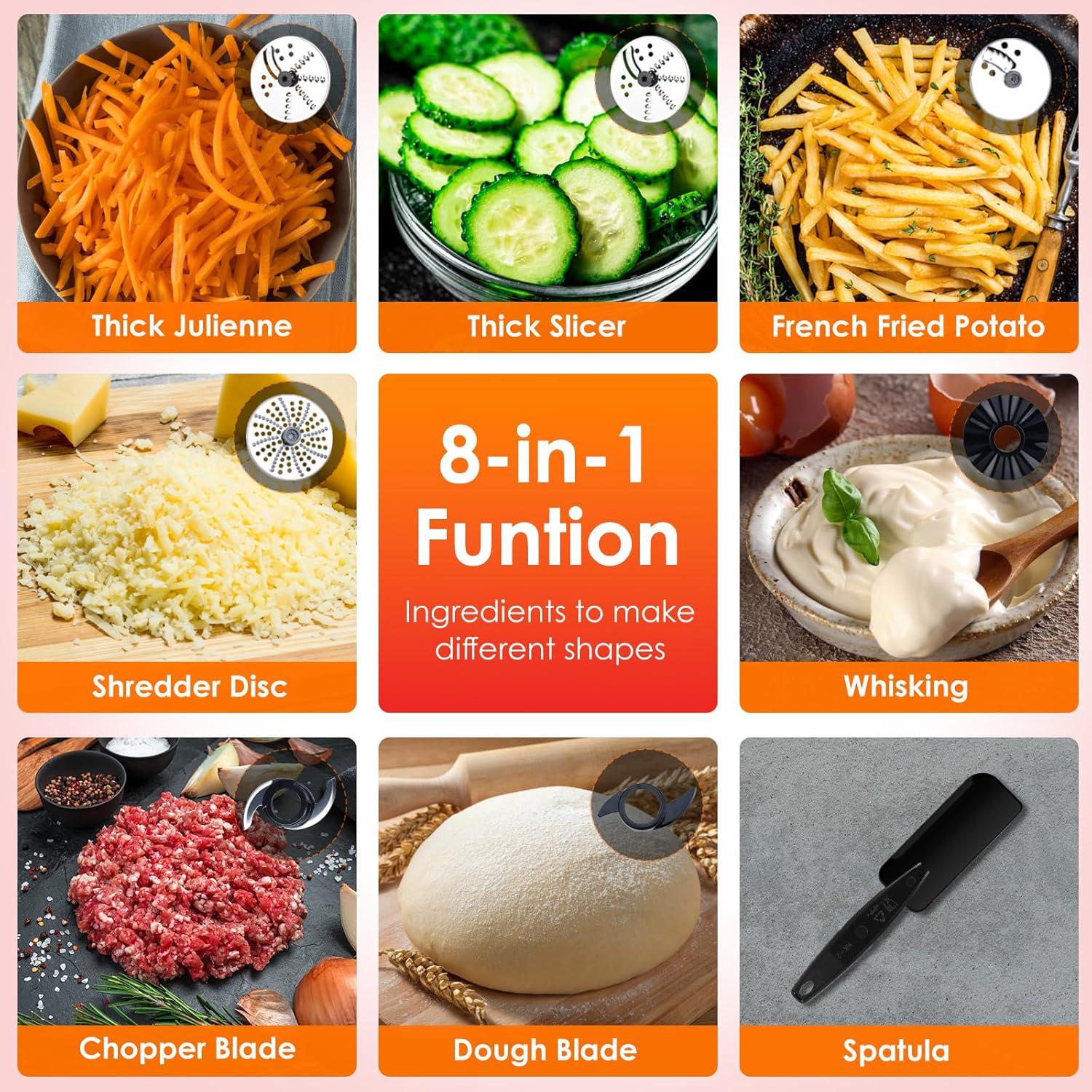 - 【8-in-1 Food Processor】Homtone food processor can handle chopping, mincing, slicing, shredding, kneading, whipping egg whites & cream, etc. Easily knead large quantities of dough, chop large quantities of vegetables, it will fulfill all your food processing needs.