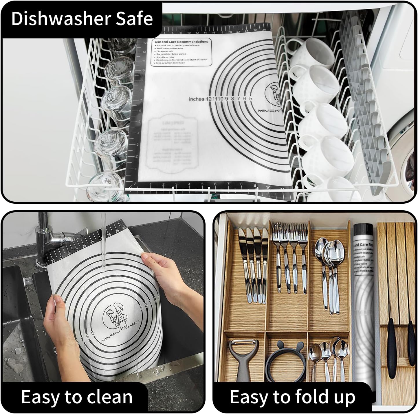 - 【𝐃𝐔𝐑𝐀𝐁𝐋𝐄 𝐒𝐈𝐋𝐈𝐂𝐎𝐍𝐄 𝐁𝐀𝐊𝐈𝐍𝐆 𝐌𝐀𝐓】: Mimekitchen pastry mat consists of multi-layers of silicone and fiberglass to reinforce the mat. It won’t rip or roll up at the edges, and very hard to crinkle or slide around as you roll the dough. It is more durable than regular slim silicone pastry sheet.