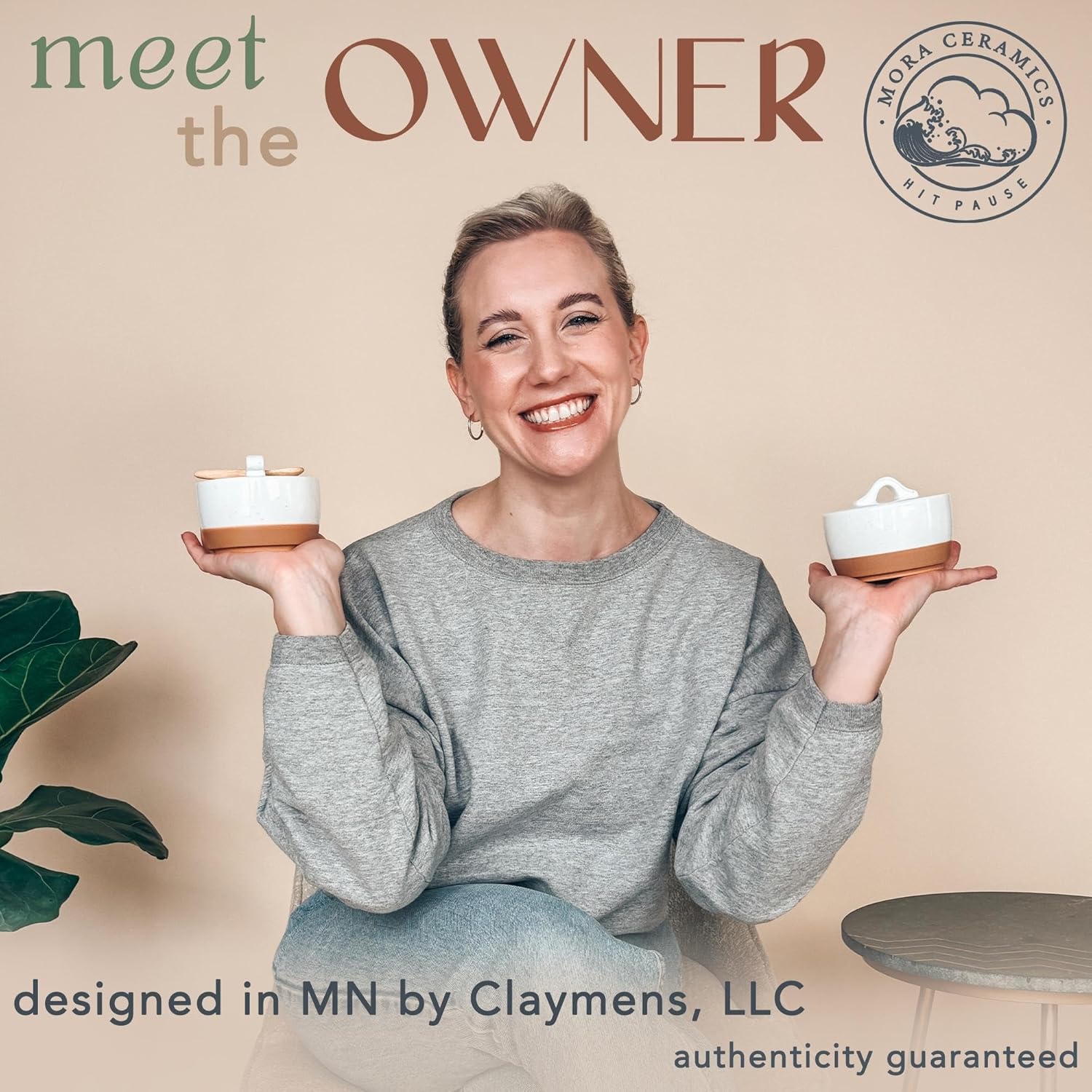 Mora Ceramic Salt and Pepper Cellar Set with Lid - 10 oz Modern Canister/Container/Bowl for Storage, Sea Salt, Spice, Sugar, Countertop - Small Dish/Jar with Wood Spoon, White Crock