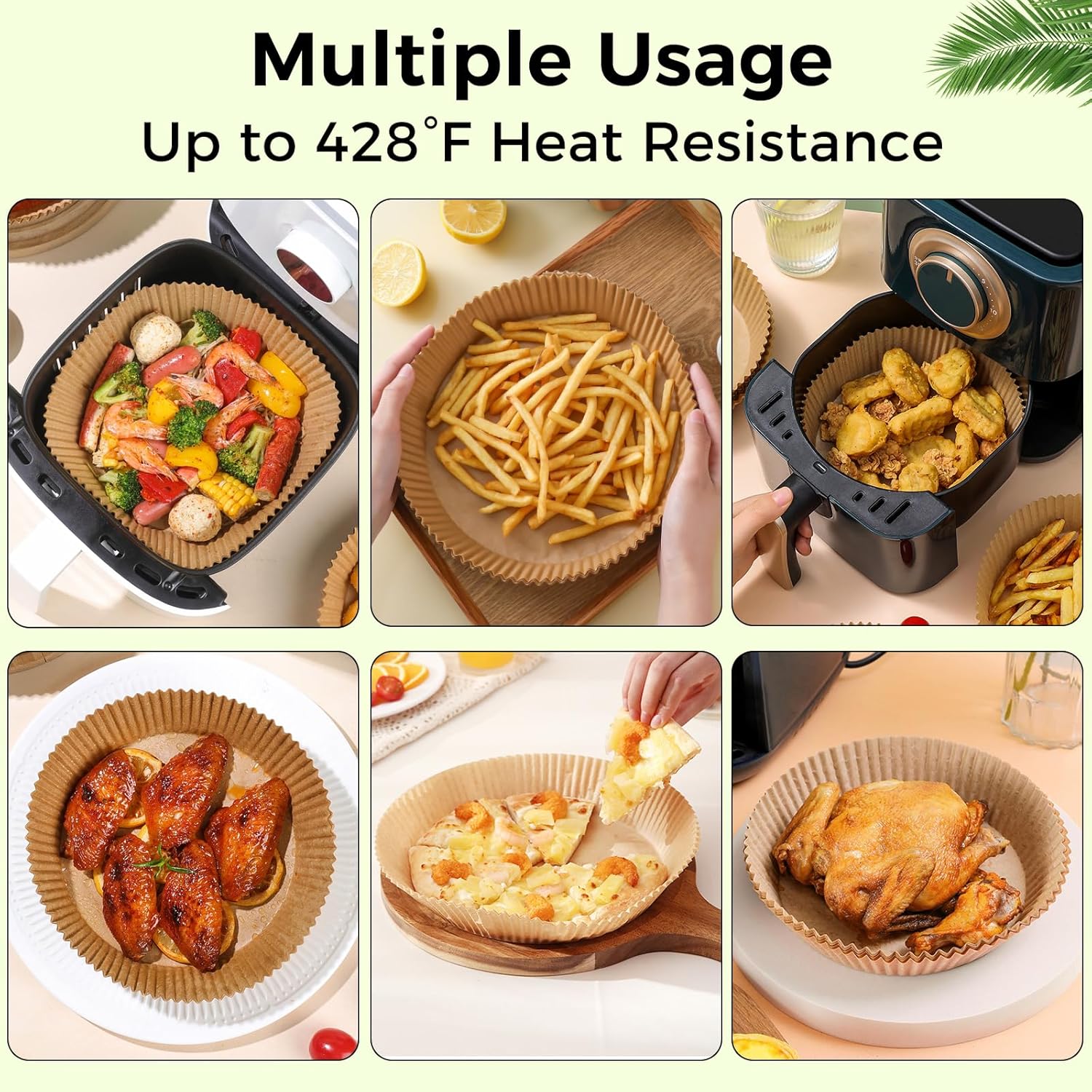 - Food Grade Materials: Made of food grade parchment, with a plant based oil treatment, our air fryer liners disposable is unbleached, BPA-free, PFAs-free, water-proof, oil-proof, non-stick, heat-proof that can withstand temperatures up to 428°F