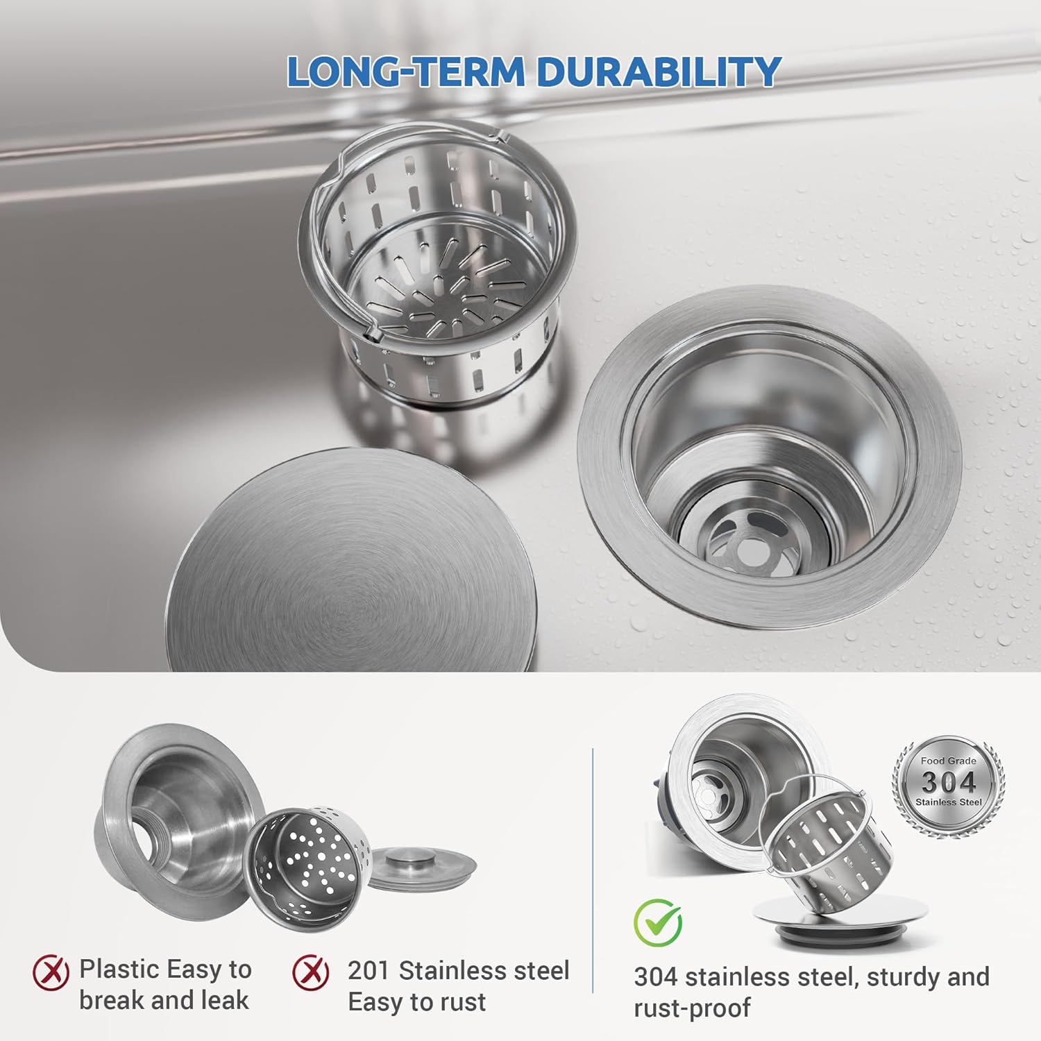 - DURABLE STAINLESS STEEL: The kitchen sink drain is made of premium 304 stainless steel for durability and resistant to rust and corrosion to provide reliable filtration for years to come (NOTE: It can not be connected to the garbage disposal.)