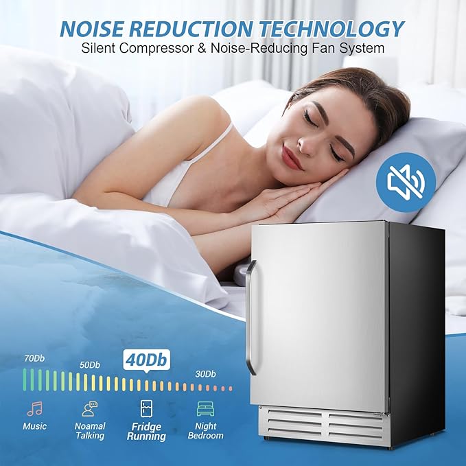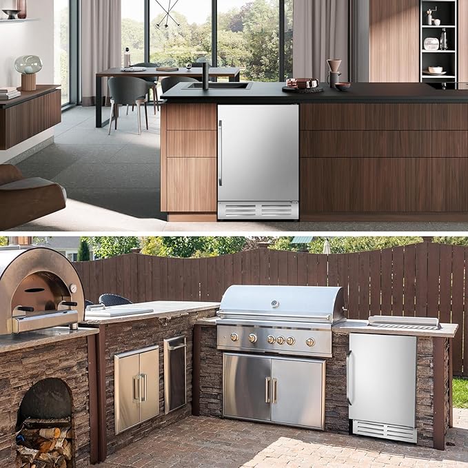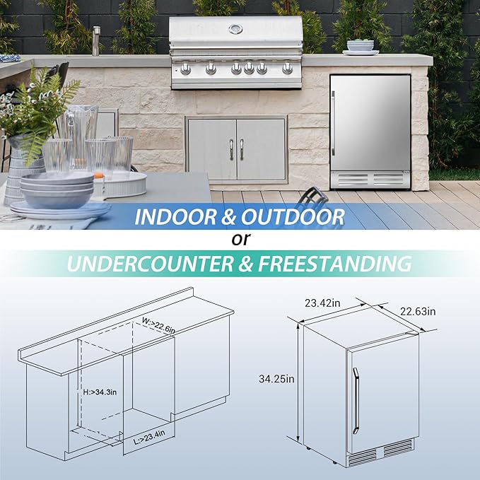 - Under Counter Built-In/Freestanding Installation- Beverage refrigerator for patio has the design of the front vent, you can install it directly under the Counter or freestanding. It can perfectly fit for 24inch space to be built-in. You can adjust the level and height of the refrigerator Via the Bottom feet