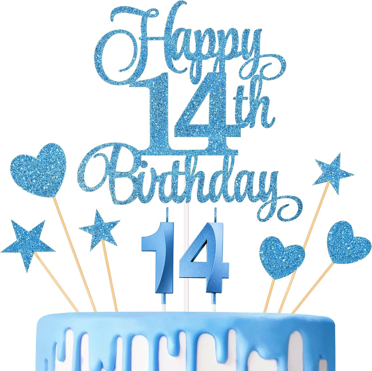 - Package content: you will receive 1 piece happy 14th birthday topper, 3 pieces star cake toppers, 3 pieces heart cake toppers and 2 pieces numeral candles, it's a great addition to the 14th birthday party and anniversary party