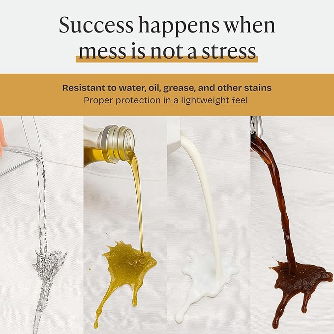 - Water, Oil, & Stain Resistant. Say goodbye to stubborn grease, pesky spills, and food stains with our Will Well Kitchen Apron. Our Teflon coated polyester material is your ultimate shield against water, oil, and dirt.