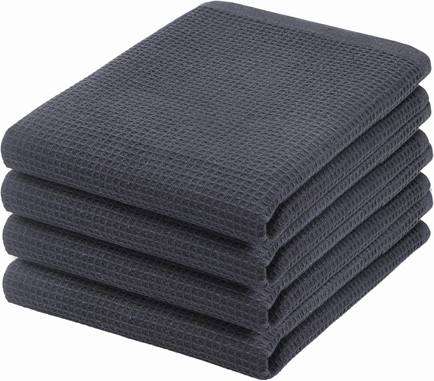 PurpleEssences Waffle Weave Kitchen Towel, 100% Cotton - 15 x 25 Inches, with Hanging Loop Ultra Soft Absorbent Quick Drying Dish Cloth, Tea and Hand Towels, 4 Pack - Spring Summer - Dark Grey