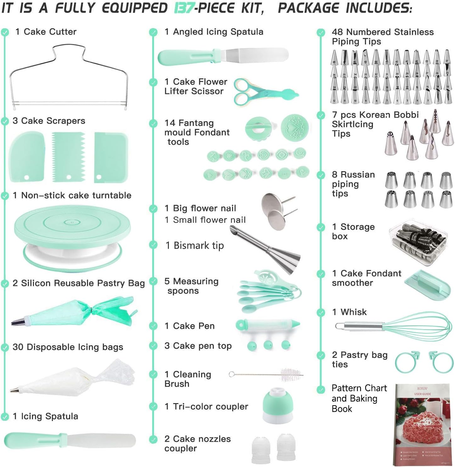 Cake Decorating Kit,137pcs Cake Decorating Supplies with Cake Turntable for Decorating,Pastry Piping Bag,Russian Piping Tips Baking Tools, Cake Baking Supplies for Beginners(Green)