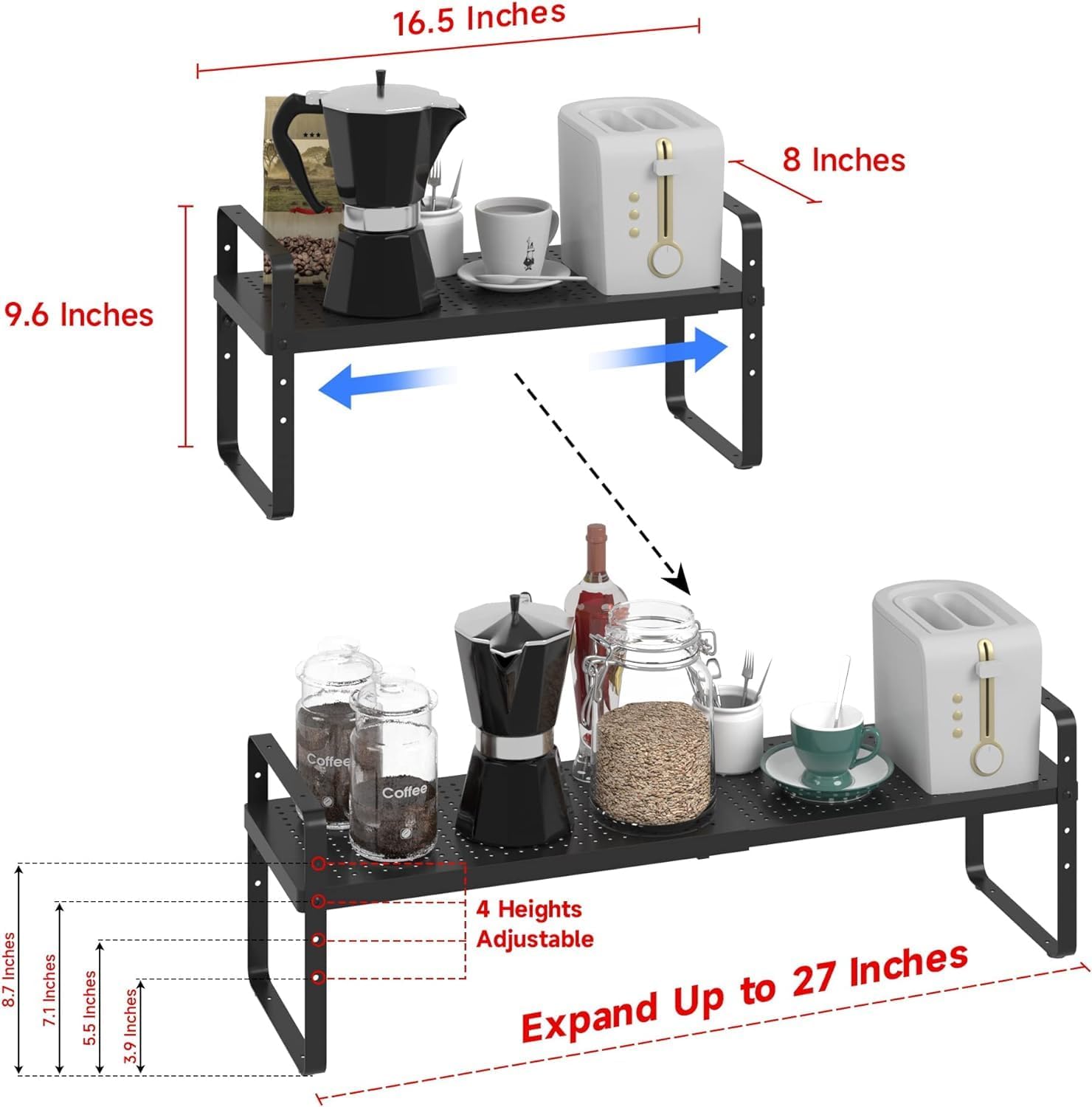 - Expandable &Stackable Cabinet Shelf Organizer: The width and height of the expandable kitchen cabinet shelves can be adjusted according to your needs, which is a very practical storage shelf. The dimensions before expansion are 16.5 "L x 8" W x 9.6 "H. Its length can be extended from 16.5" to 27". You can also stack the 2pack shelves together to form a two-layer storage space. Or it can be used as 2 single shelves separately