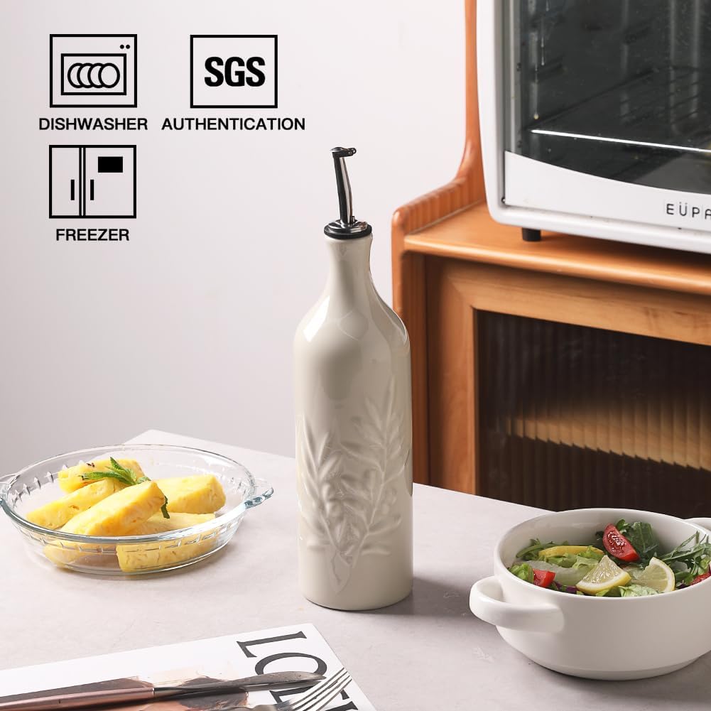Sweejar Large Ceramic Olive Oil Dispenser Bottle, 24 Oz Relief Opaque Oil Cruet Protects Oil To Reduce Oxidation, Storage Vinegar, Soy Sauce, Coffee Syrup, Liquids, Set of 1 (Beige)