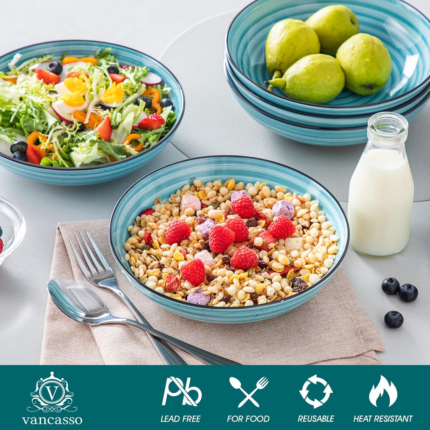 - 【Multifunctional Pasta Bowls】 These shallow bowls set are suitable for soups, cereal, burrito bowls, stir fries, seafood, stews, casseroles, and more. vancasso pasta bowls are suitable for all delicious food!