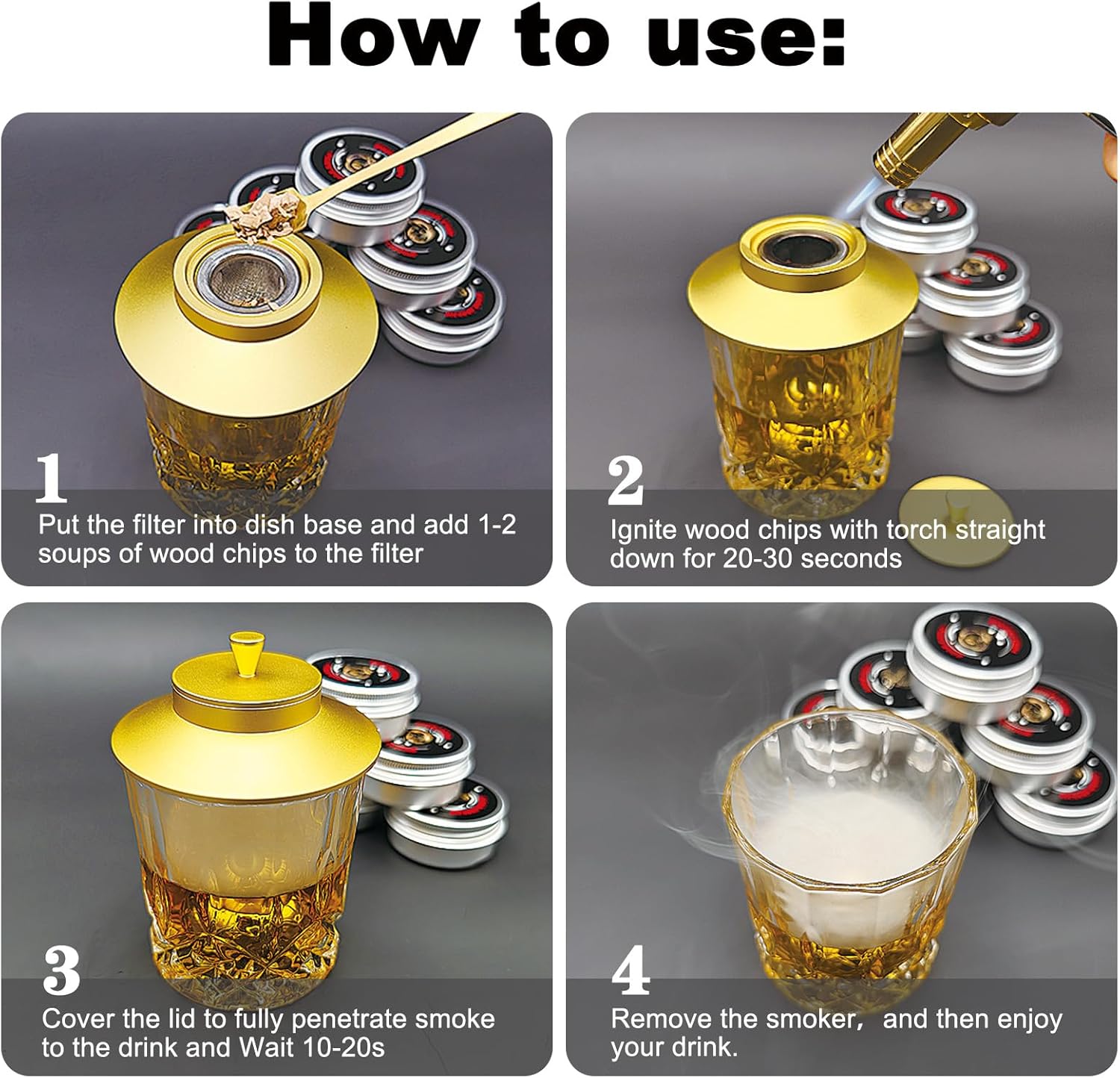 - Drink smoker kit is very simple to operate, prepare the smoking gun, mixed wine and cup, use smoking gun to ignite chips which need fully burn, smoke top for cocktails and shake it slightly, stand for a few minutes, flavored drink is made