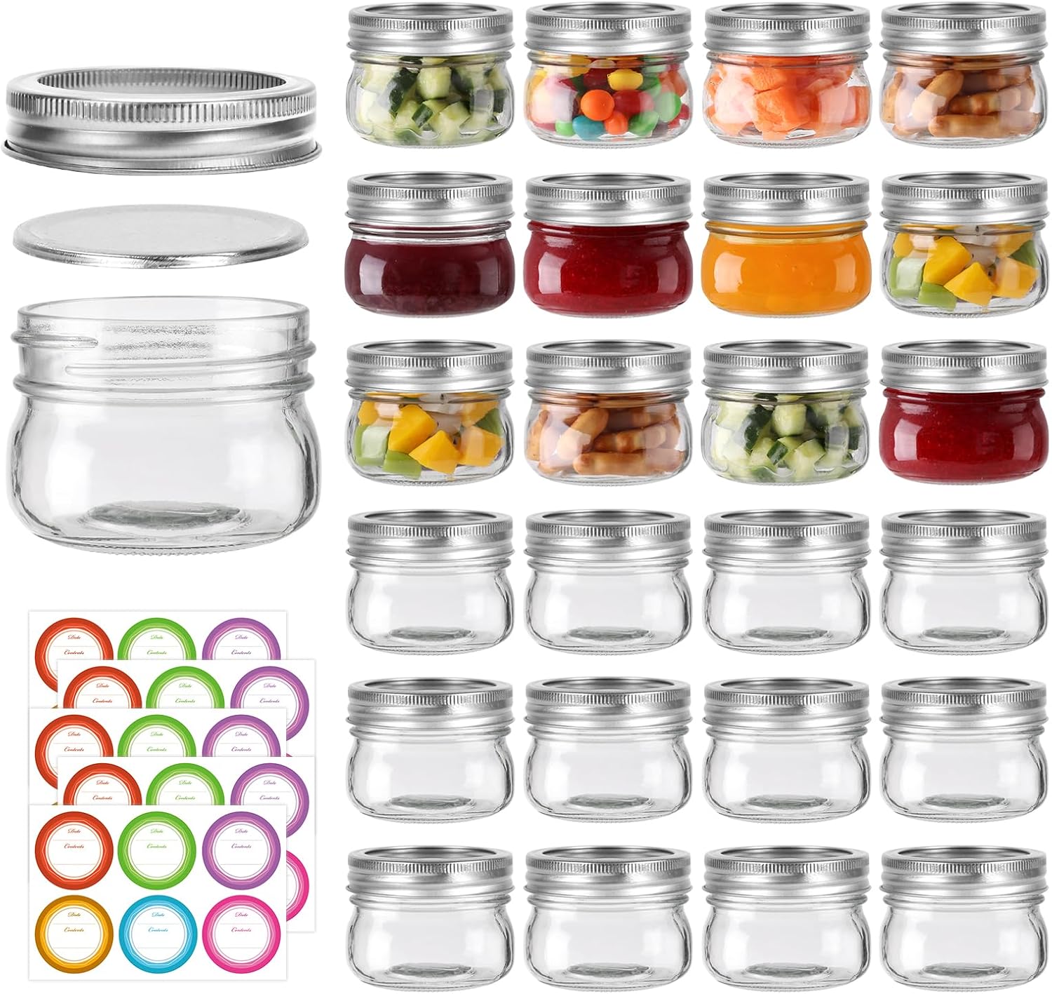 4 oz Mason Jars With Silver Lids and Bands, 24 Pack Regular Mouth Canning Jars for Jam, Honey, Yogurt, Candy, Spices, Snacks, DIY Projects, Wedding Favors- Includes 30 Stickers