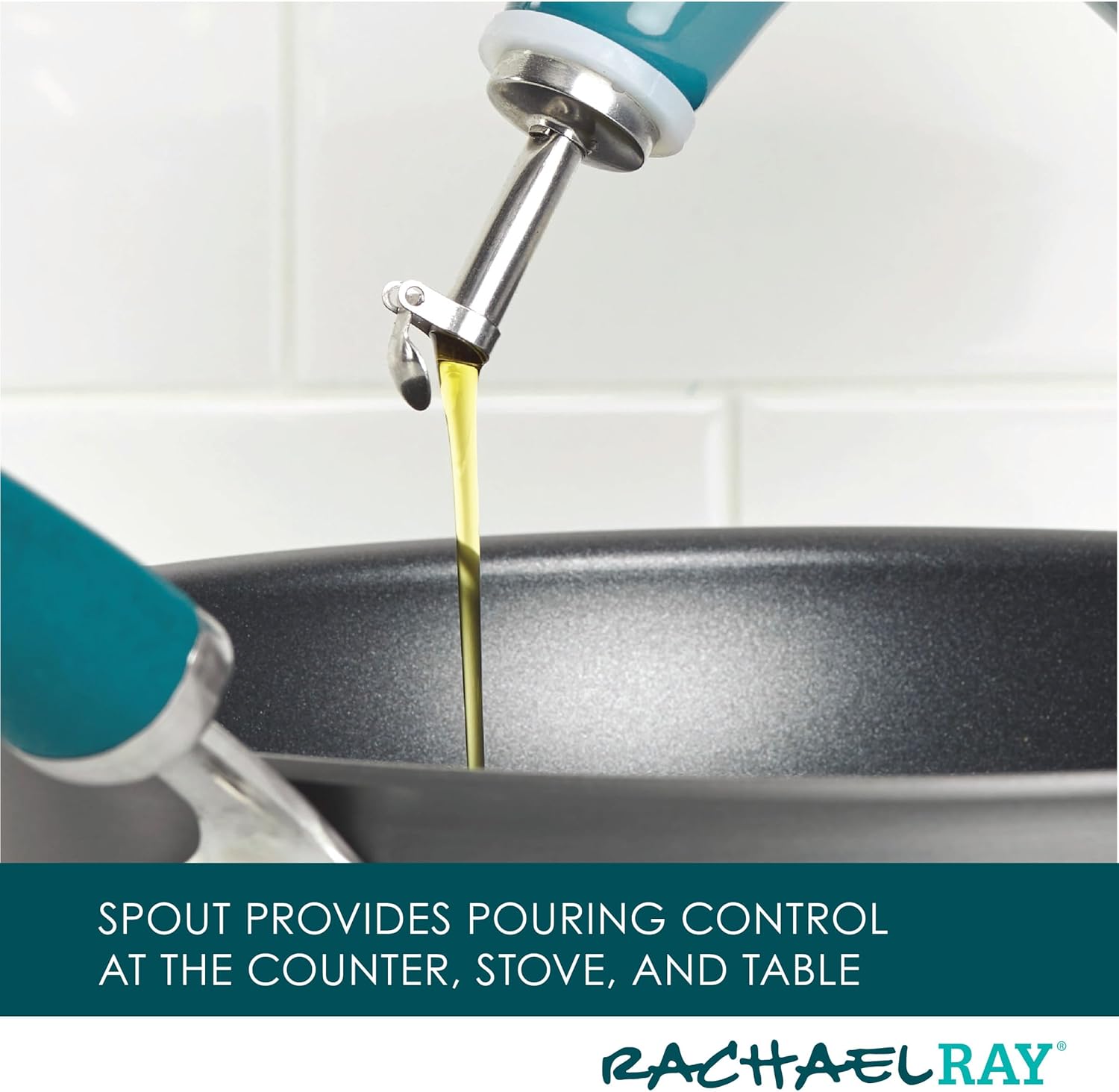 - PRECISION POUR: Rachael Ray EVOO bottle is ideal for use as a cruet and salad dressing dispenser and features unique spout designed for perfect pouring of oil and vinegar