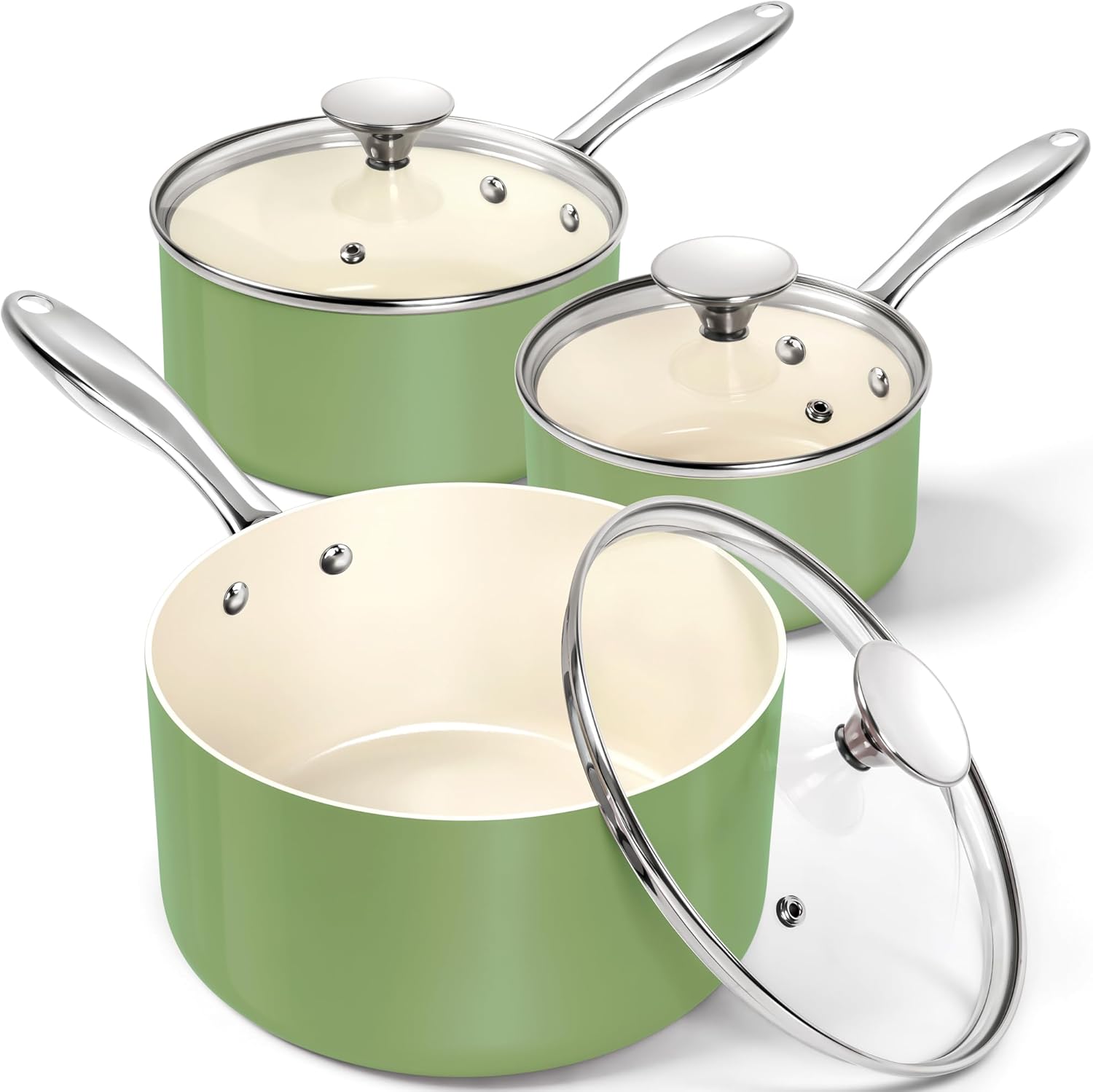 MICHELANGELO Sauce Pan with Lid, Non Stick Saucepan Set of 3-1Qt & 2Qt & 3Qt Small Pots for Cooking, Ceramic Saucepan - Non-Toxic, Scratch-Resistant, Oven Safe, Natural Green