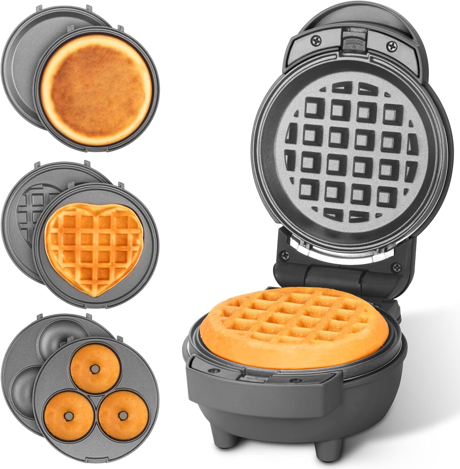 Baker's Friend 4 in 1 Mini Waffle Maker with Removable Plates, A Set of Mini Pancake Maker, Mini Donut Maker, Mini Heart Shape Waffle Maker and Small Waffle Maker, Recipe Included, Graphite, Compact