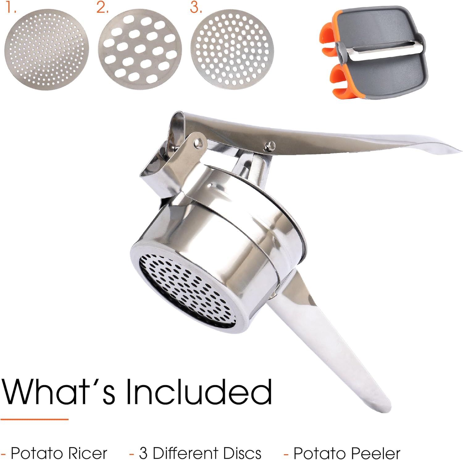 Potato Ricer with Stainless Steel Potato Peeler and 3 Interchangeable Discs | 15 oz Stainless Steel Potato Masher, Kitchen Gadget for Potatoes, Potato Ricer Kitchen Tool by Savver