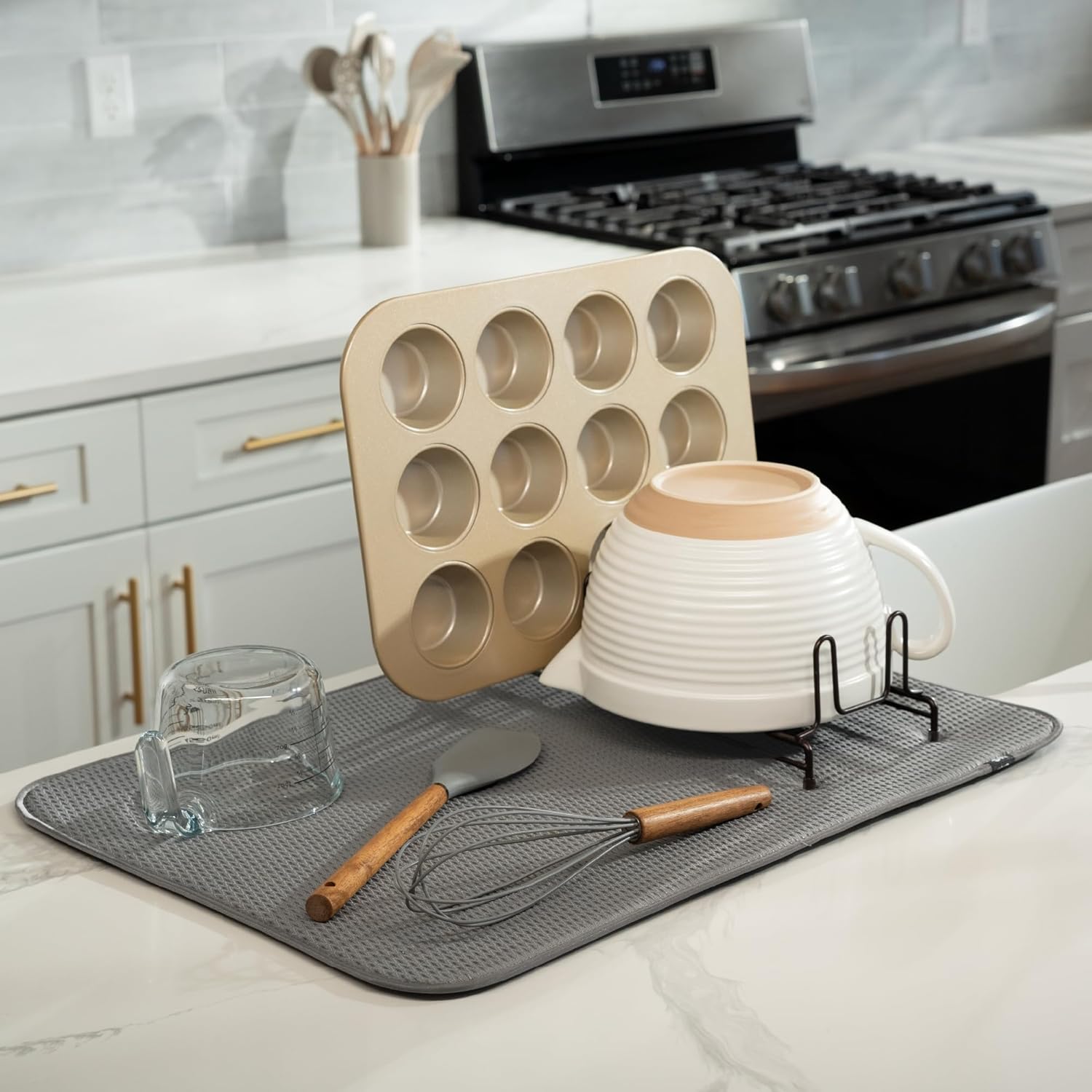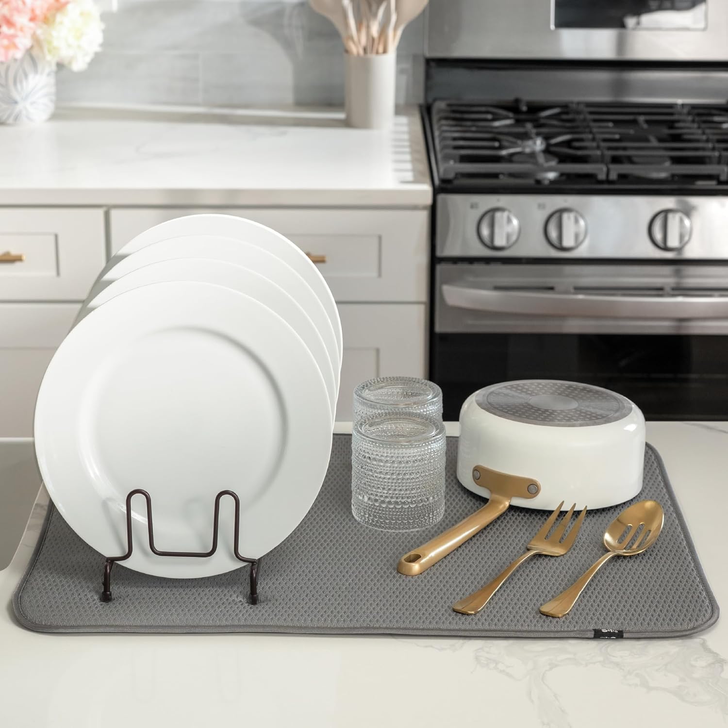 - One Envision Home by S&T INC. Microfiber Dish Dry Mat XL measuring 18 in. x 24 in.; kitchen mat for countertop absorbs up to 4 times its weight in water to keep your countertop dry, unlike a silicone dish drying mat