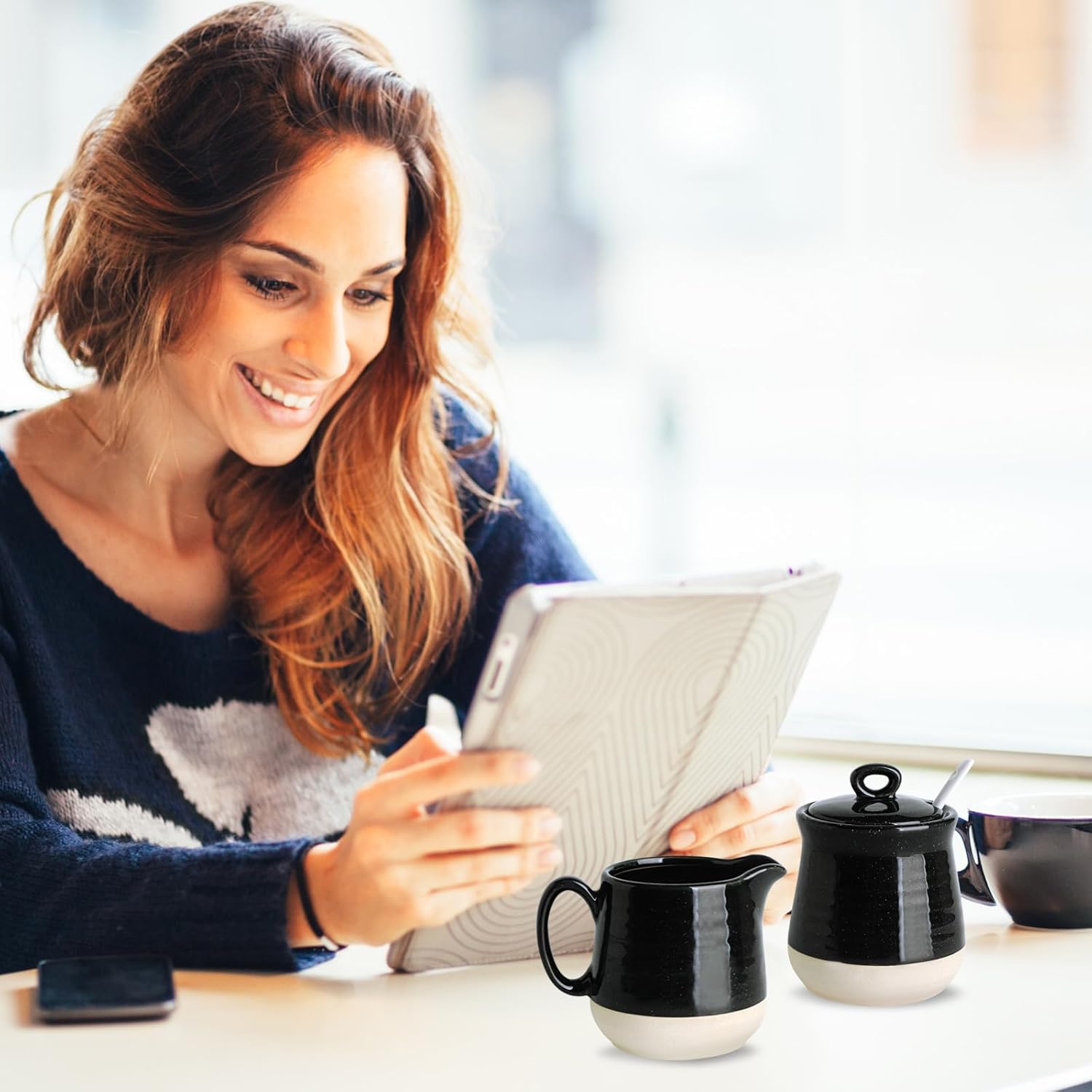 Hasense Sugar and Creamer Set, 3 Piece Porcelain Coffee Serving Set with Cream Pitcher, Sugar Bowl, Lid & Spoon, 10 Ounce Creamer Container and Sugar Pot, Farmhouse Decor (Black)
